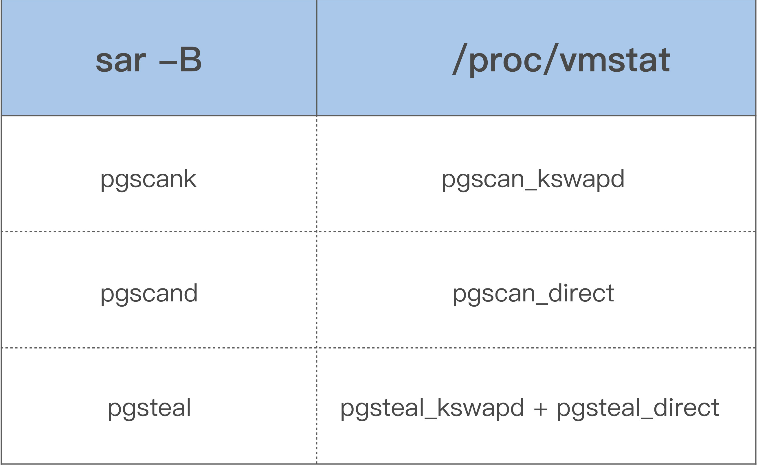 这几个指标也是通过解析/proc/vmstat里面的数据来得出的,对应关系如下: