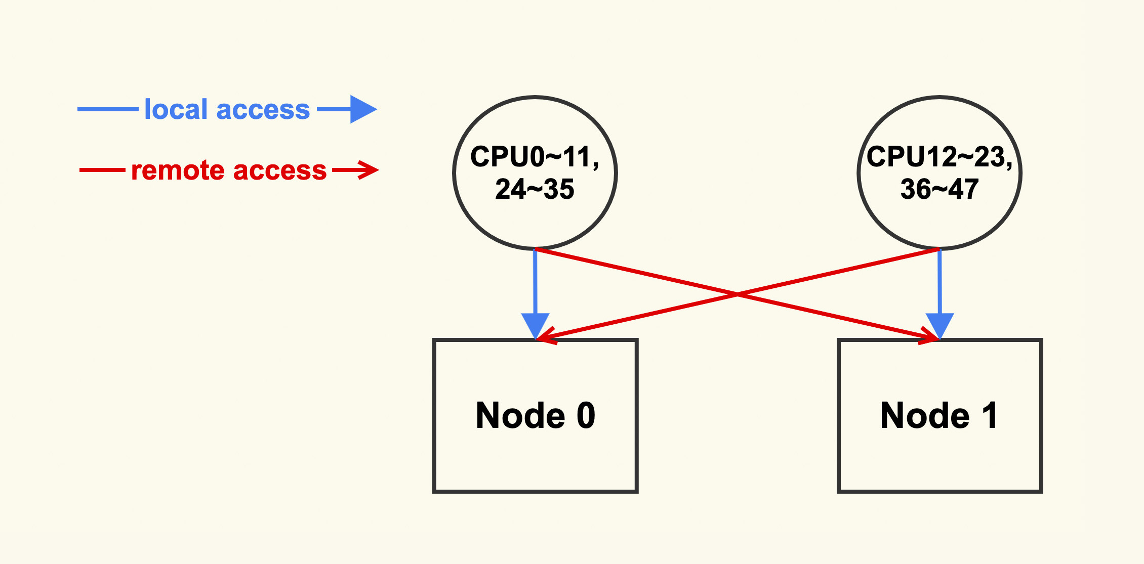其中CPU0~11,24~35的local node为node 0;而CPU12~23,36~47的local node为node 1。如下图所示: