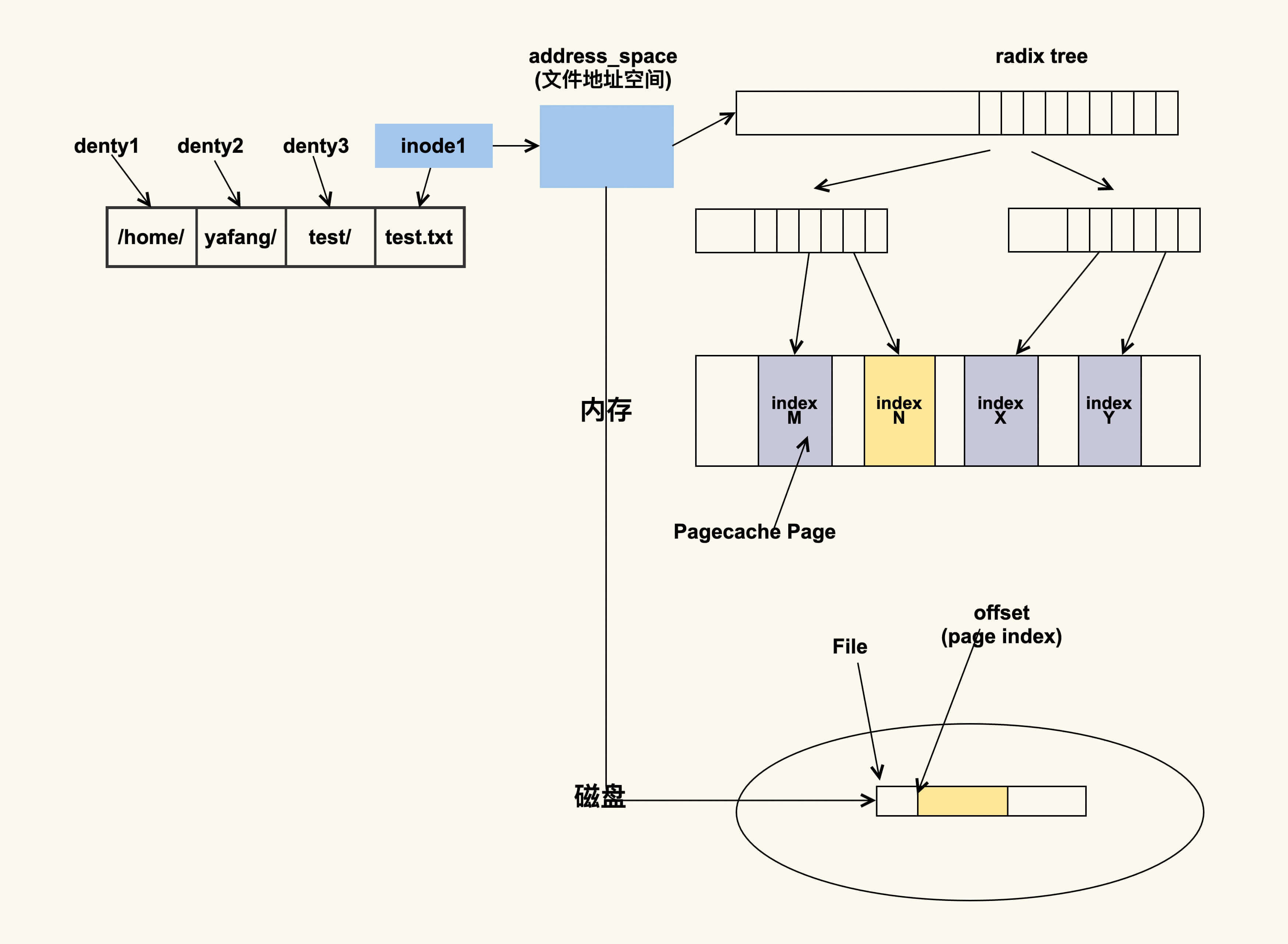 如上图所示,进程会通过inode来找到文件的地址空间(address_space),然后结合文件偏移(会转换成page index)来找具体的Page。如果该Page存在,那就说明文件内容已经被读取到了内存;如果该Page不存在那就说明不在内存中,需要到磁盘中去读取。你可以理解为inode是Pagecache Page(页缓存的页)的宿主(host),如果inode不存在了,那么PageCache Page也就不存在了。