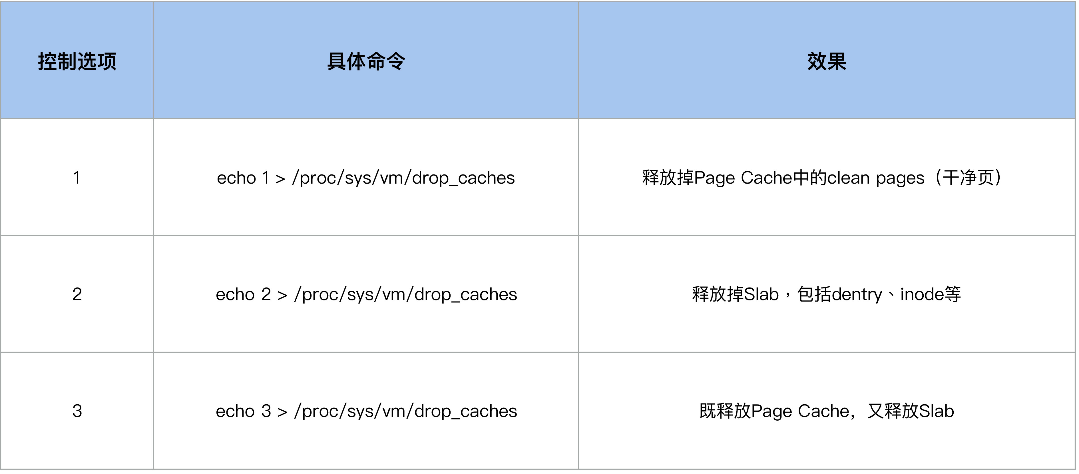 如果你使用过drop_cache来释放inode的话,应该会清楚它有几个控制选项,我们可以通过写入不同的数值来释放不同类型的cache(用户数据Page Cache,内核数据Slab,或者二者都释放),这些选项你可以去看Kernel Documentation的描述。
