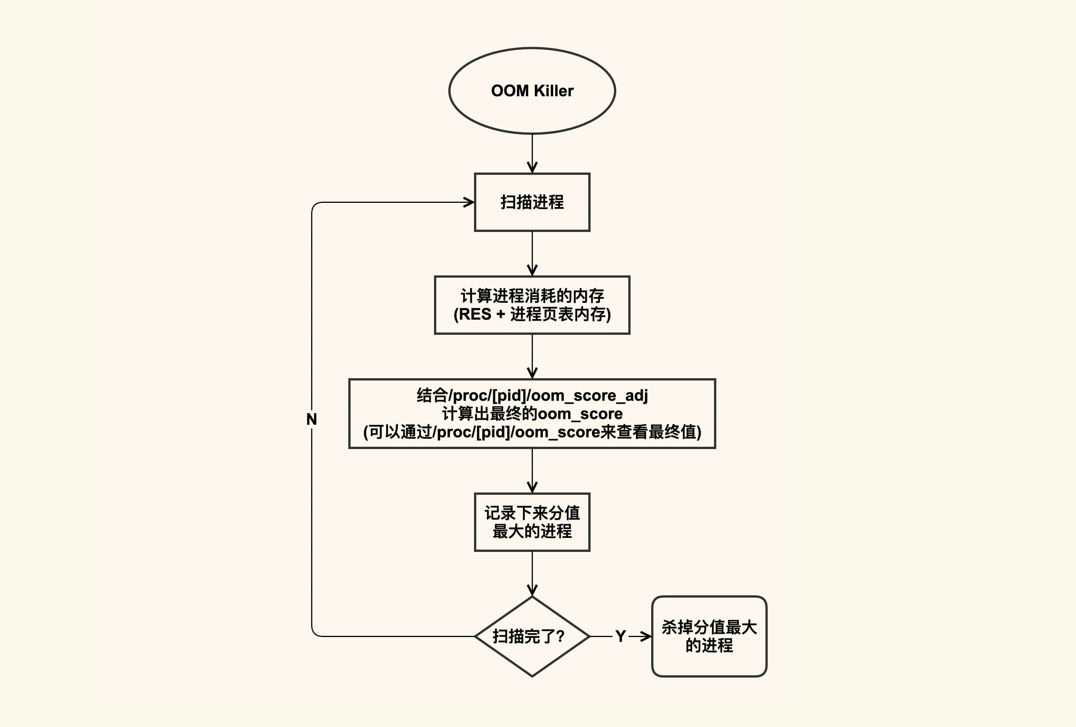 OOM killer在杀进程的时候,会把系统中可以被杀掉的进程扫描一遍,根据进程占用的内存以及配置的oom_score_adj来计算出进程最终的得分,然后把得分(oom_score)最大的进程给杀掉,如果得分最大的进程有多个,那就把先扫描到的那个给杀掉。