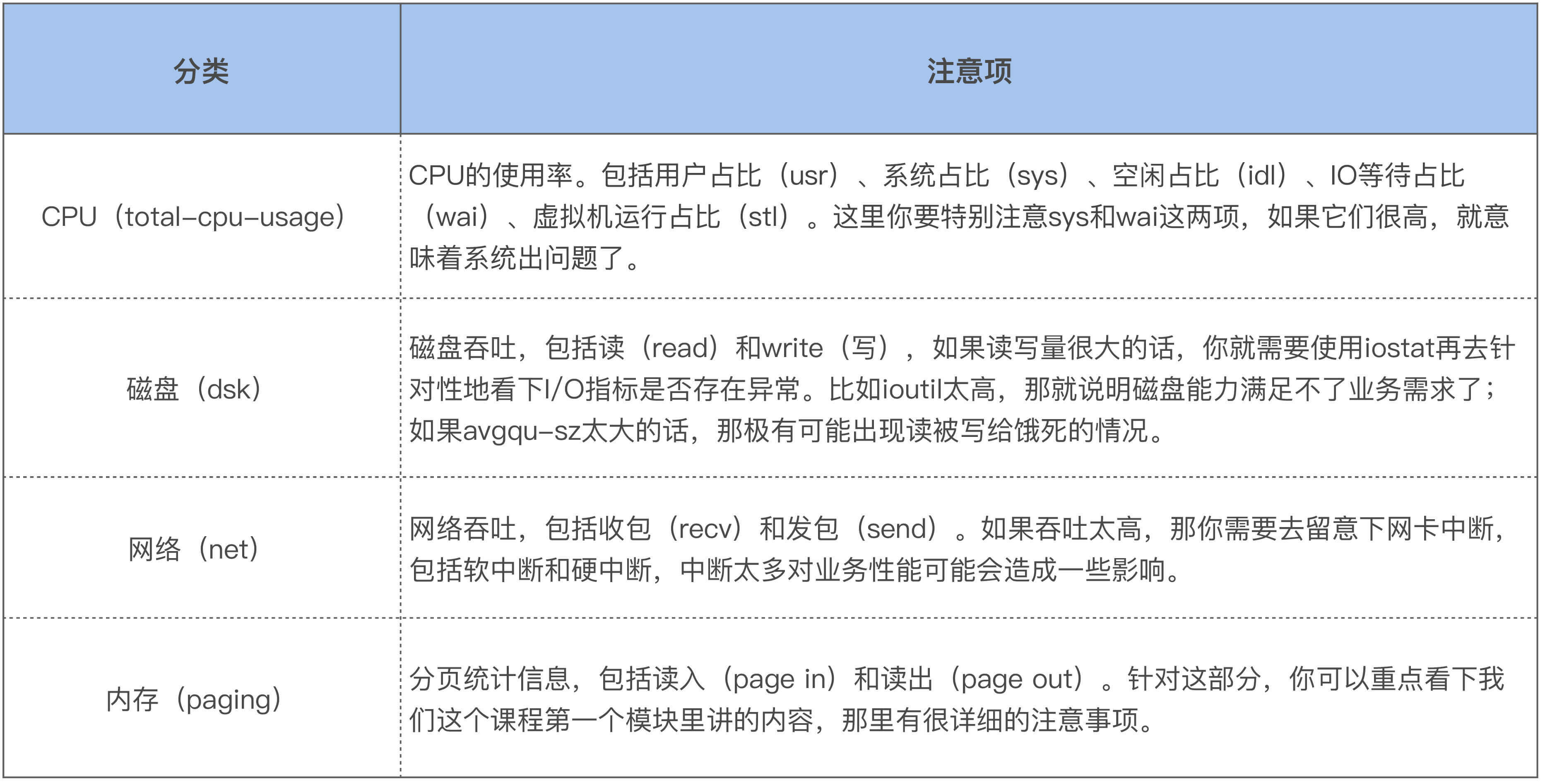 如上所示,dstat会显示四类系统资源的整体使用情况和两个关键的系统指标。这四类系统资源分别是:CPU、磁盘I/O、 网络和内存。两个关键的系统指标是中断次数(int)和上下文切换次数(csw)。而每个系统资源又会输出它的一些关键指标,这里你需要注意以下几点: