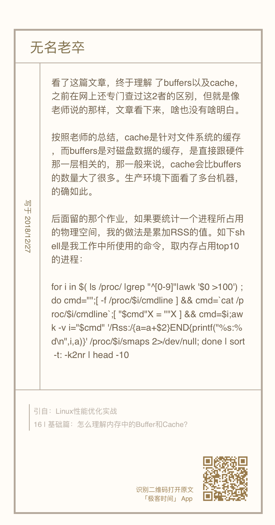 这其实是 怎么理解内存中的Buffer和Cache 的课后思考题,无名老卒、Griffin、JohnT3e 等少数几个同学,都给出了一些思路。