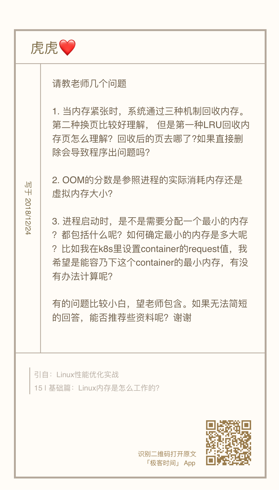 每个问题,我都附上了留言区提问的截屏。如果你需要回顾内容原文,可以扫描每个问题右下方的二维码查看。