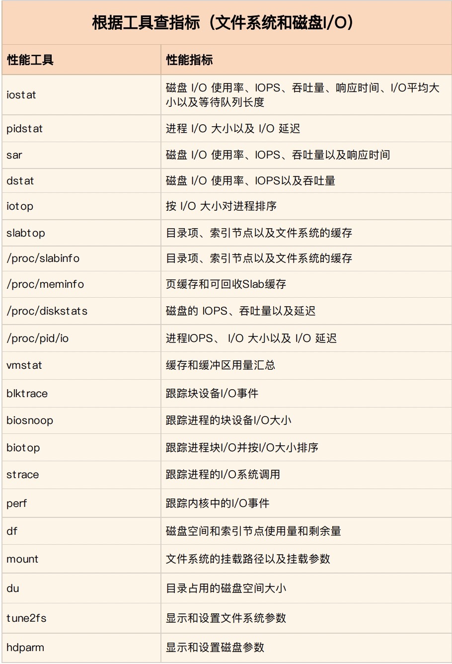第一个维度,从文件系统和磁盘 I/O 的性能指标出发。换句话说,当你想查看某个性能指标时,要清楚知道,哪些工具可以做到。