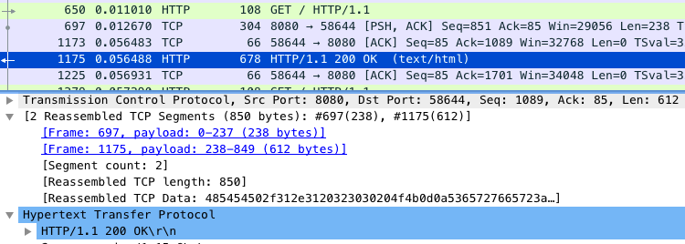 仔细观察 Wireshark 的界面,其中, 1173 号包,就是刚才说到的延迟 ACK 包;下一行的 1175 ,则是 Nginx 发送的第二个分组包,它跟 697 号包组合起来,构成一个完整的 HTTP 响应(ACK 号都是 85)。