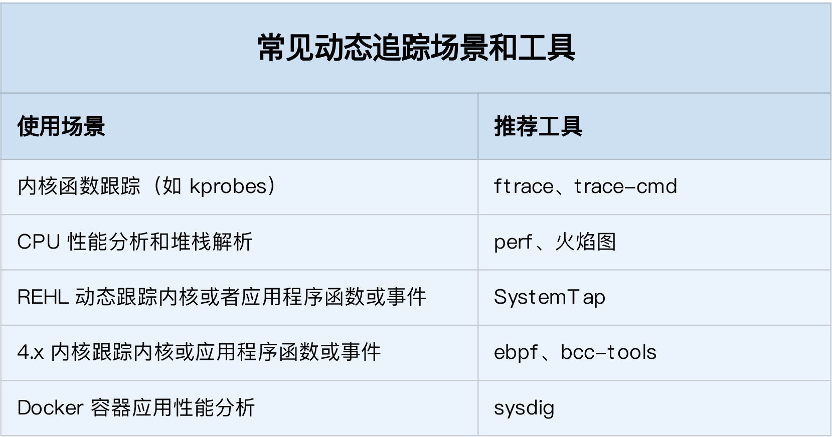 在这里,我也总结了几个常见的动态追踪使用场景,并且分别推荐了适合的工具。你可以保存这个表格,方便自己查找并使用。