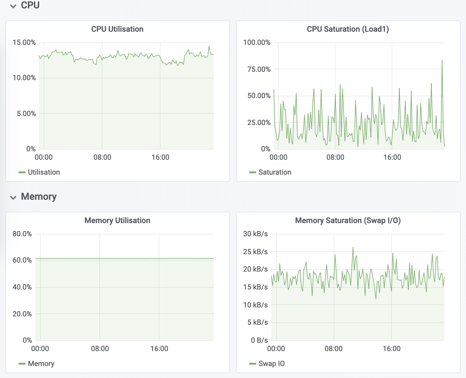 比如,以刚才提到的 USE 方法为例,我使用 Prometheus,可以收集 Linux 服务器的 CPU、内存、磁盘、网络等各类资源的使用率、饱和度和错误数指标。然后,通过 Grafana 以及 PromQL 查询语句,就可以把它们以图形界面的方式直观展示出来。