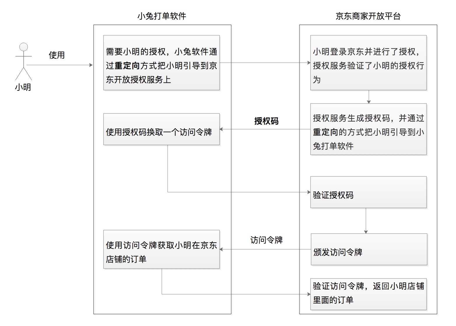 京东商家开放平台:“你好,小兔打单软件。我收到了小明的授权,现在要给你生成一个授权码 code 值,我通过浏览器重定向到你的回调 URL 地址上面了。”