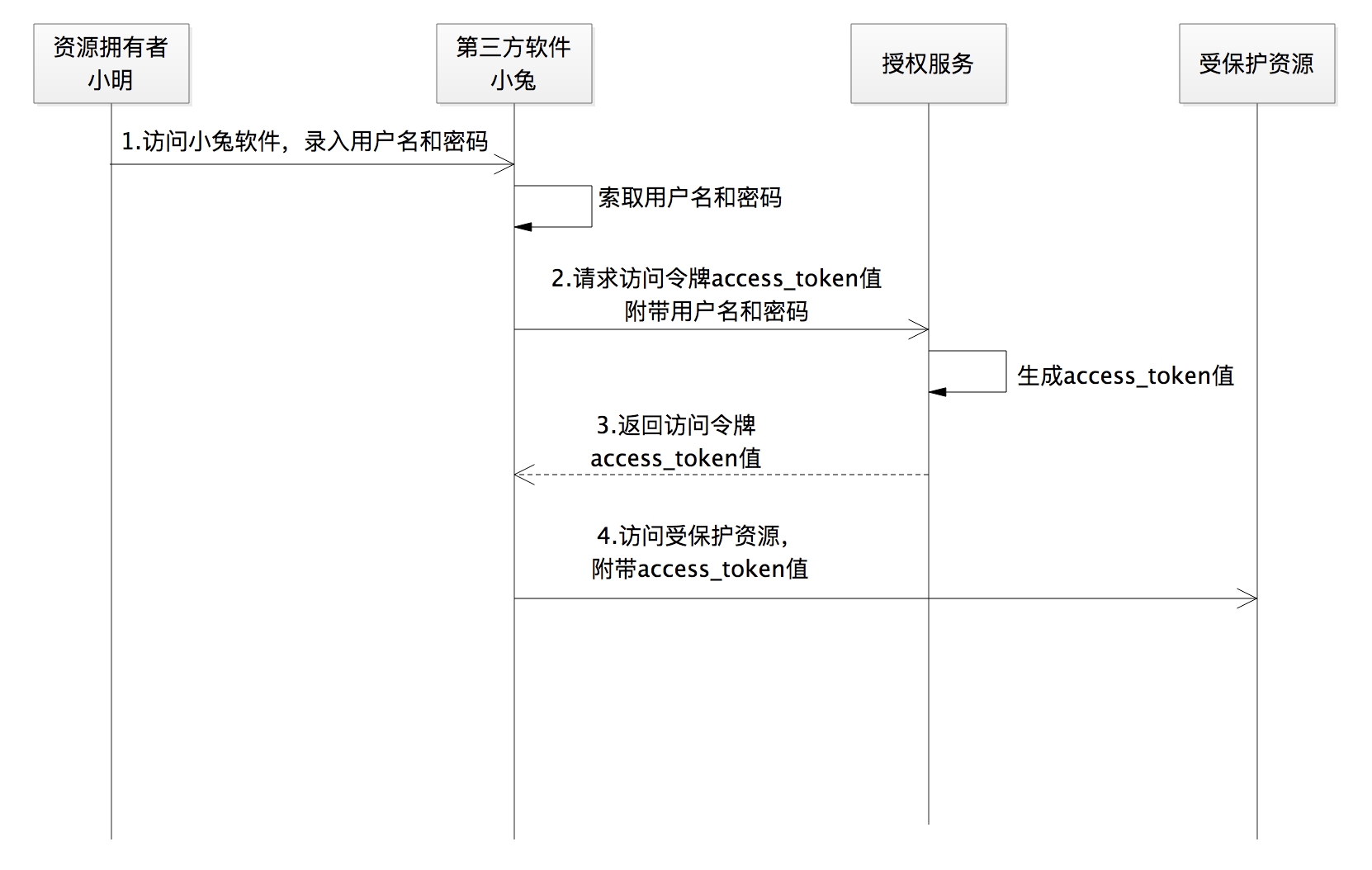 我们还是以小明使用小兔软件为例,来看下客户端凭据许可的整个授权流程,如下图所示: