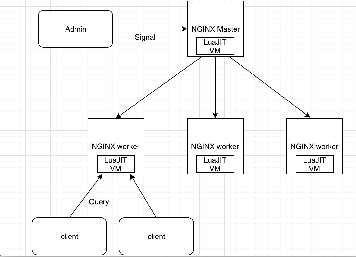 OpenResty 的 master 和 worker 进程中,都包含一个 LuaJIT VM。在同一个进程内的所有协程,都会共享这个 VM,并在这个 VM 中运行 Lua 代码。