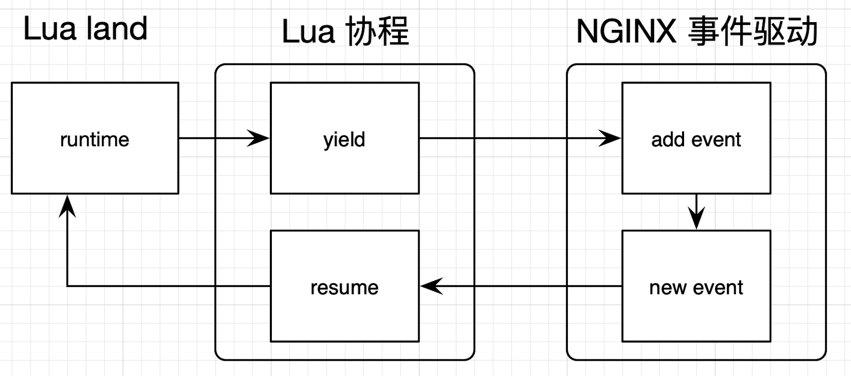 在 OpenResty 层面,Lua 的协程会与 NGINX 的事件机制相互配合。如果 Lua 代码中出现类似查询 MySQL 数据库这样的 I/O 操作,就会先调用 Lua 协程的 yield 把自己挂起,然后在 NGINX 中注册回调;在 I/O 操作完成(也可能是超时或者出错)后,再由 NGINX 回调 resume 来唤醒 Lua 协程。这样就完成了 Lua 协程和 NGINX 事件驱动的配合,避免在 Lua 代码中写回调。