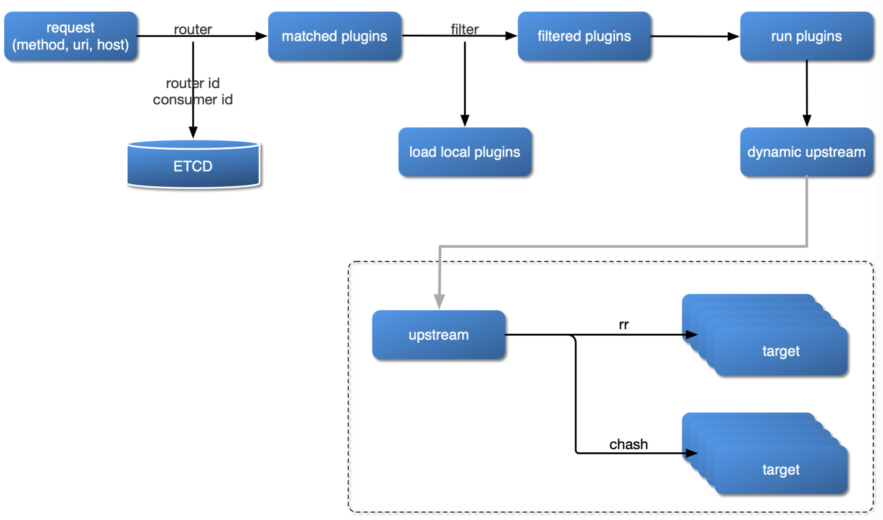 • 首先,会根据请求的方法、uri、host、请求头等条件,去路由规则中进行匹配。如果命中了某条路由规则,就会从 etcd 中获取对应的插件列表。