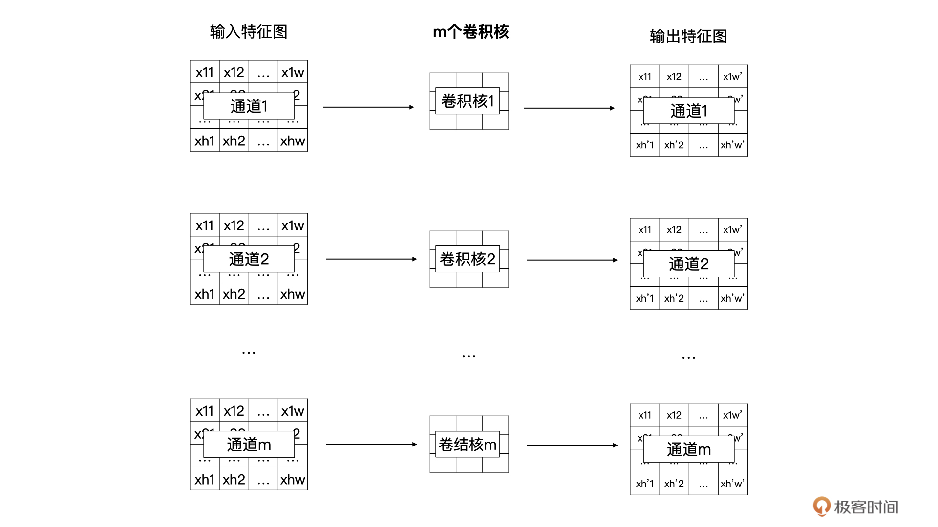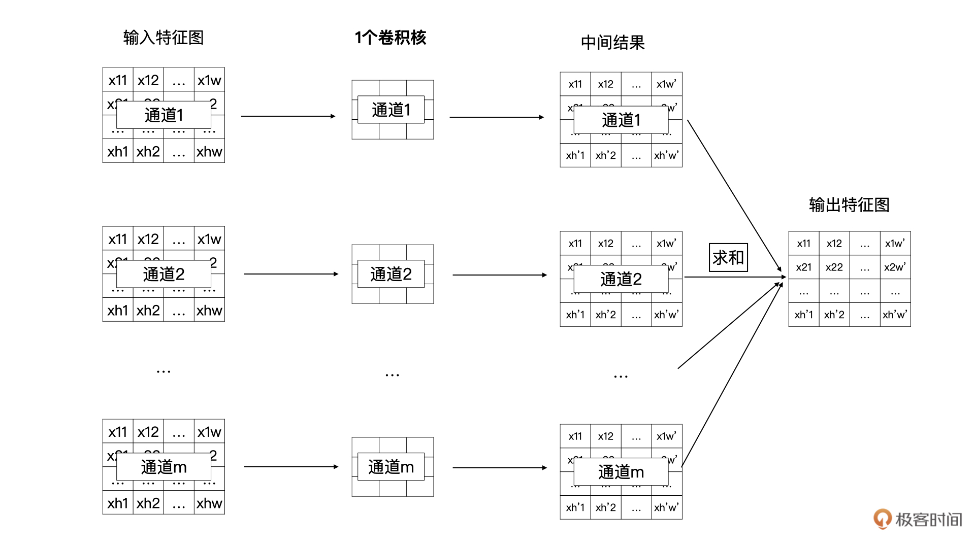 我们将特征图与一个卷积核计算的过程展开一下,请看下图。一个卷积核中的m个卷积分别与输入特征图的m个通道数据进行卷积计算,生成一个中间结果,然后m个中间结果按位求和,最终就能获得n个输出特征图中的一个特征图。-