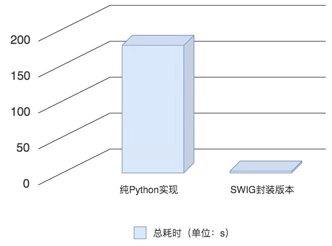 最后,我们分别对纯Python实现的代码,和使用SWIG封装的版本来进行测试,各自都执行1,000,000次,然后对比执行时间。我用一张图表示了我的机器上得到的结果,你可以对比看看。