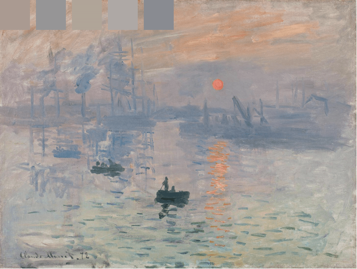 在本节课,我打算使用一幅莫奈的名画《日出·印象》来教你,如何使用Pillow库提取图片中被用到最多的五种颜色并将它们作为色块标注在图片上。下面的截图就是我们要实现的最终效果,接下来我就教你如何来实现它。