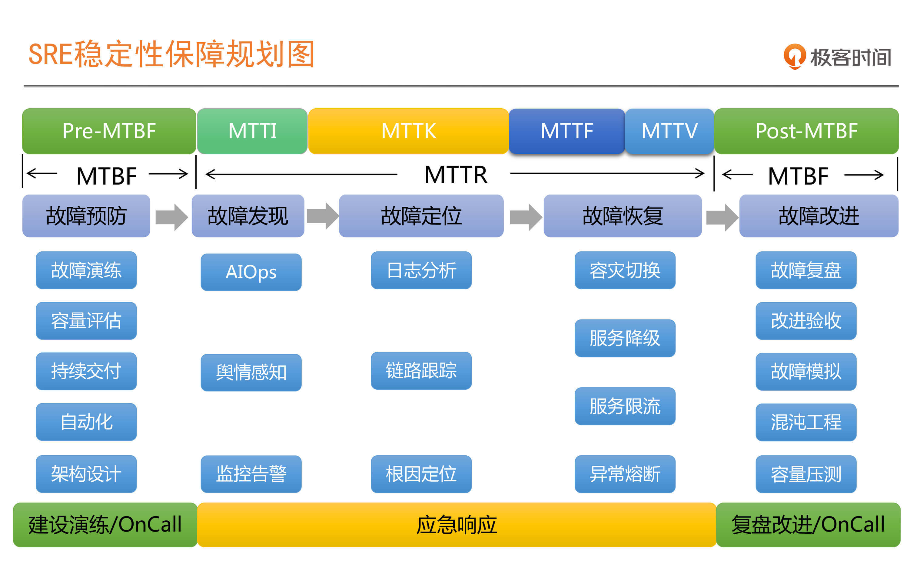还来看前面的SRE稳定性保障规划图,你会发现我们把整个软件运行周期按照这两个指标分成了两段。通俗地说,MTBF指示了系统正常运行的阶段,而MTTR则意味着系统故障状态的阶段。-