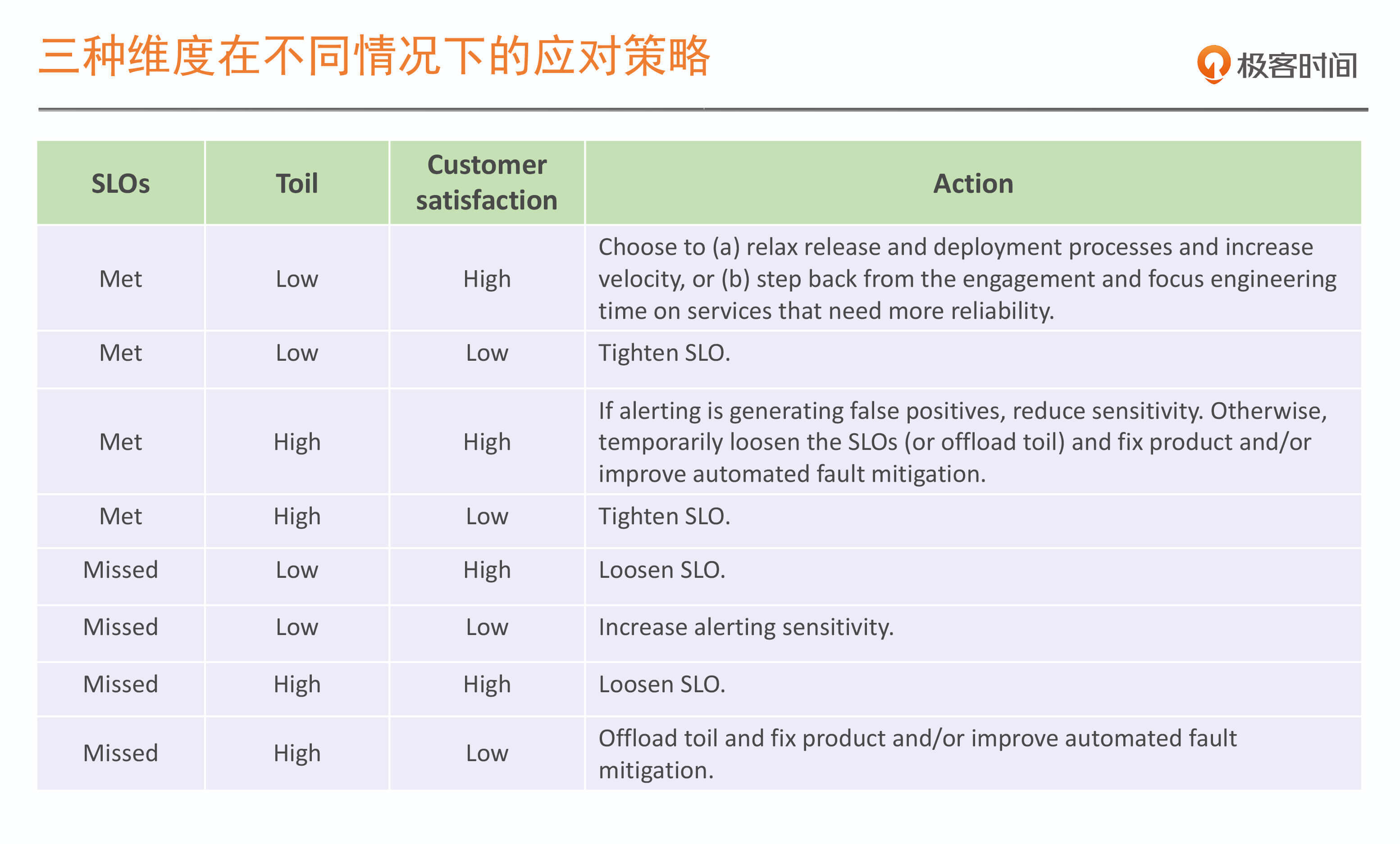 比如表格第一行,是我们期望的最理想状态,SLO能达成,人肉投入又低,客户满意度又很高,也没有特别的优化空间,这时我们就可以增加发布和变更次数,更大程度地释放生产力。