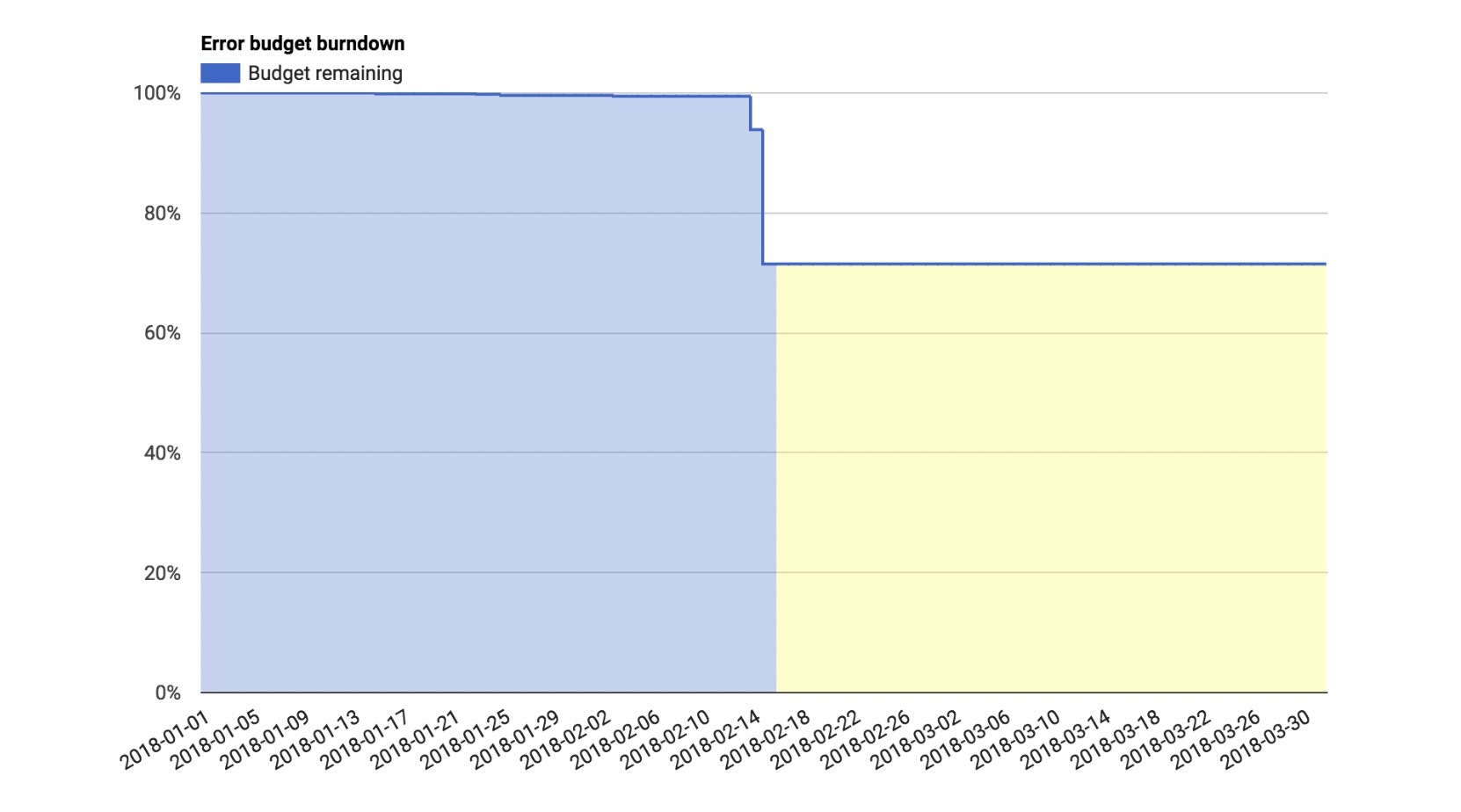 这里,可以参考Google给出的一个错误预算的燃尽图,这个从技术上,通过你日常使用的监控平台配置一个Metric就可以实现,并不复杂。- - 在应用错误预算的时候,你要考虑设定一个合理的周期,比如1天、1周或1个月。