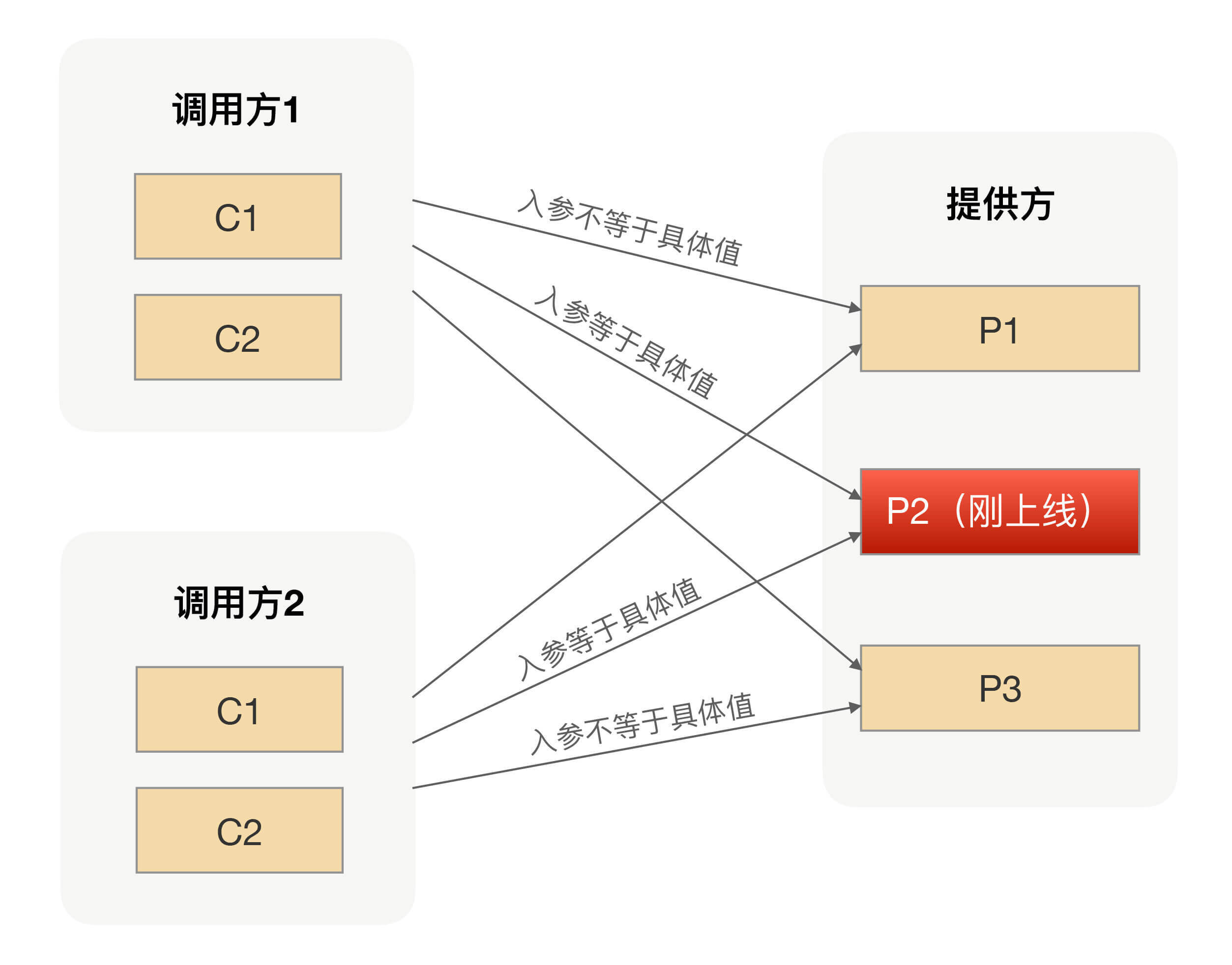 那如果没法100%规避风险,我们还能怎么办?我认为只有一条路可以尝试了,就是尽量减小上线出问题导致业务受损的范围。基于这个思路,我们是不是可以在上线完成后,先让一小部分调用方请求过来进行逻辑验证,待没问题后再接入其他调用方,从而实现流量隔离的效果。那在RPC框架里面我们具体该怎么实现呢?