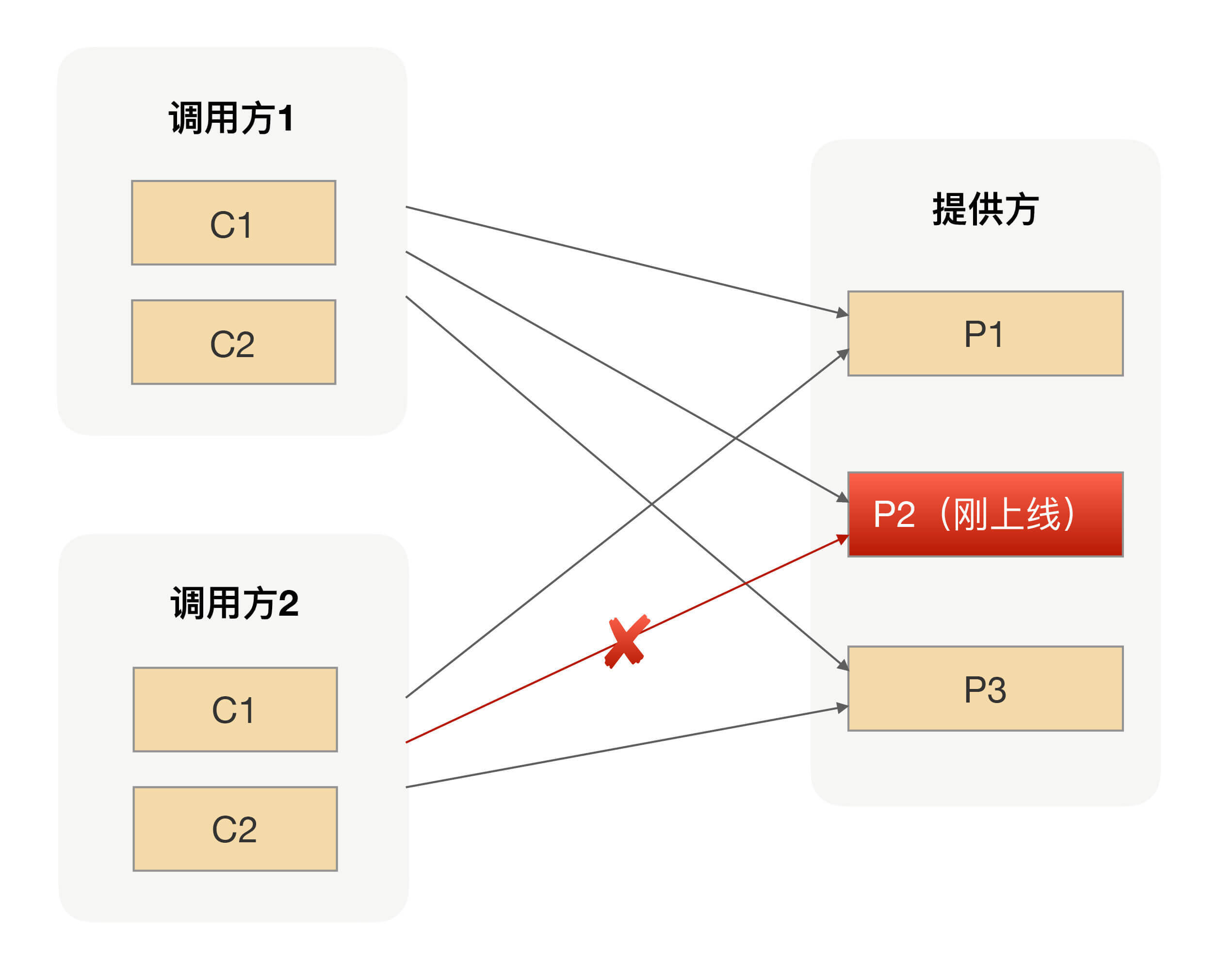但这种方式不好的一点就是,线上一旦出现问题,影响范围还是挺大的。因为对于我们的服务提供方来说,我们的服务会同时提供给很多调用方来调用,尤其是像一些基础服务的调用方会更复杂,比如商品、价格等等,一旦刚上线的实例有问题了,那将会导致所有的调用方业务都会受损。