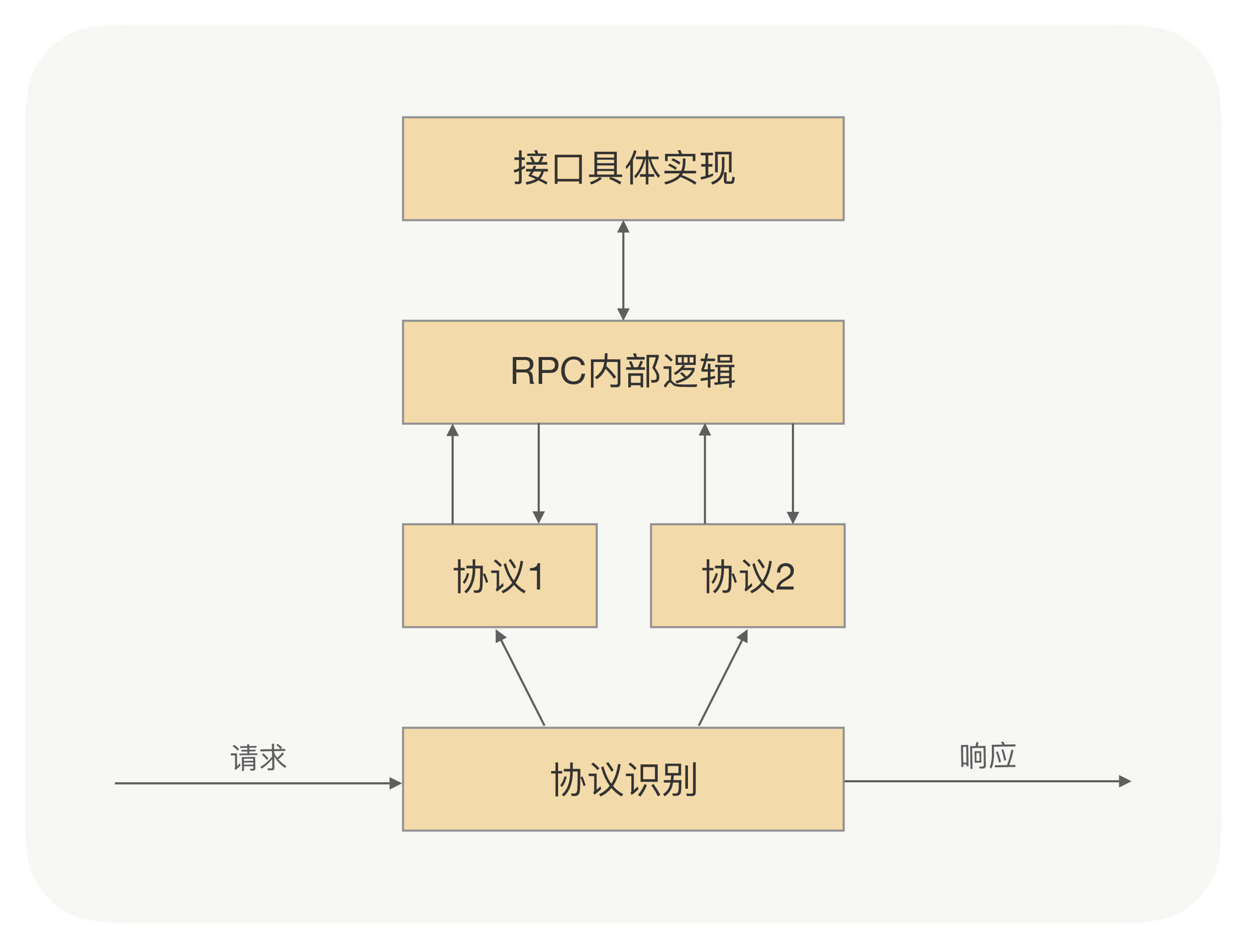在我们日常开发的过程中,最难的环节不是从0到1完成一个新应用的开发,而是把一个老应用通过架构升级完成从70分到80分的跳跃。因为在老应用升级的过程中,我们不仅需要考虑既有的功能逻辑,也需要考虑切换到新架构上的成本,这就要求我们在设计新架构的时候要考虑如何让老应用能够平滑地升级,就像在RPC里面支持多协议一样。