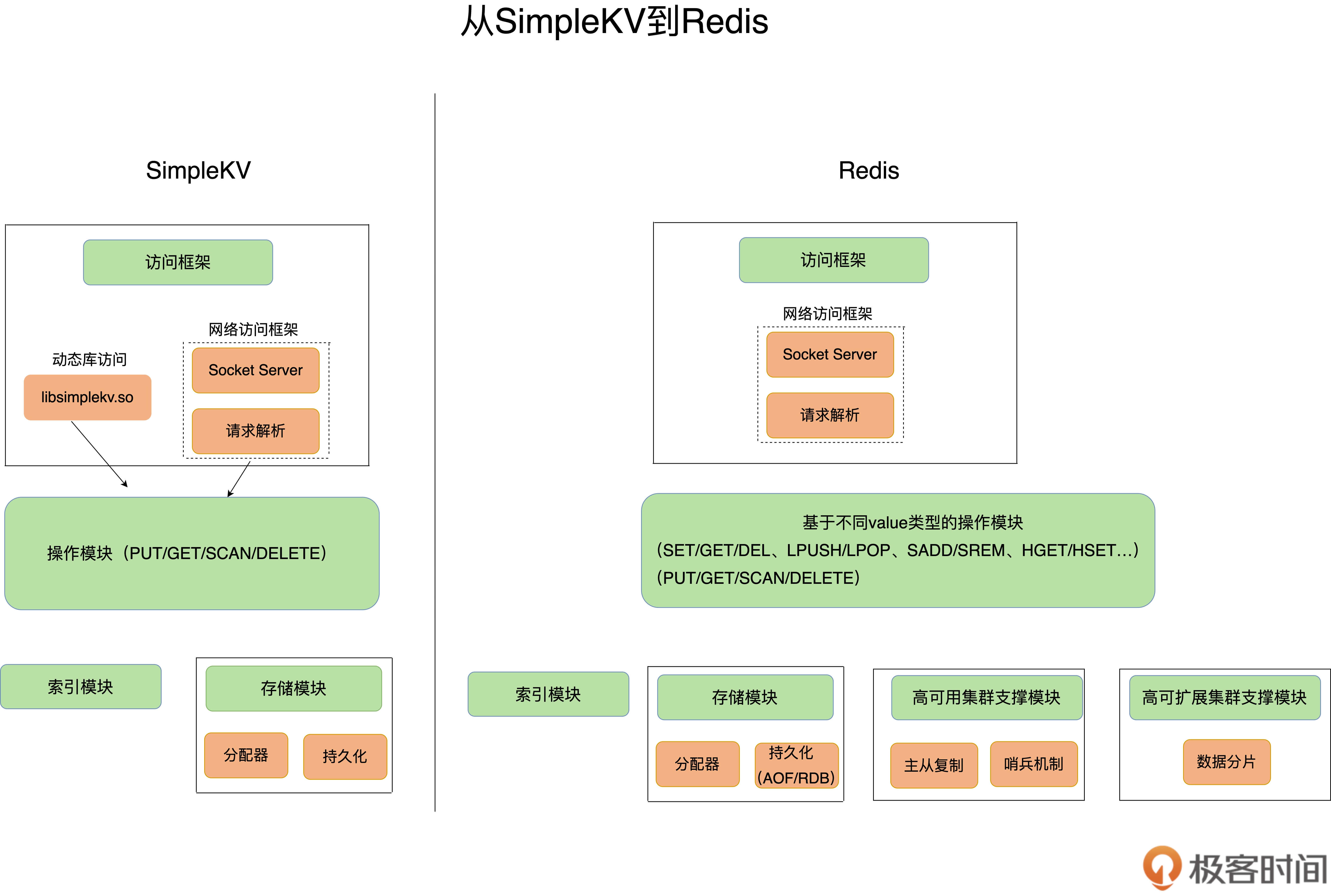 从这张对比图中,我们可以看到,从 SimpleKV 演进到 Redis,有以下几个重要变化: