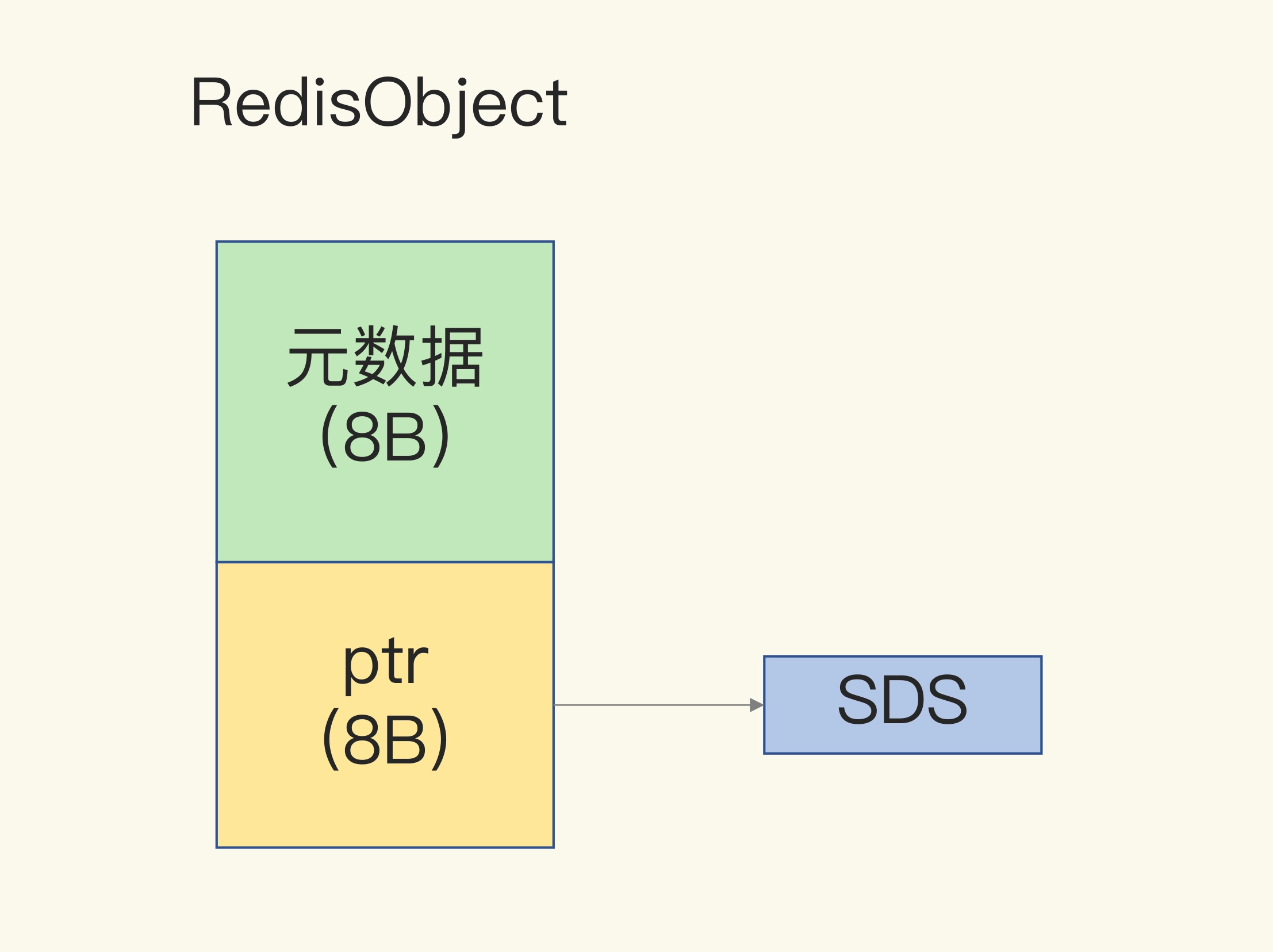 一个 RedisObject 包含了 8 字节的元数据和一个 8 字节指针,这个指针再进一步指向具体数据类型的实际数据所在,例如指向 String 类型的 SDS 结构所在的内存地址,可以看一下下面的示意图。关于 RedisObject 的具体结构细节,我会在后面的课程中详细介绍,现在你只要了解它的基本结构和元数据开销就行了。