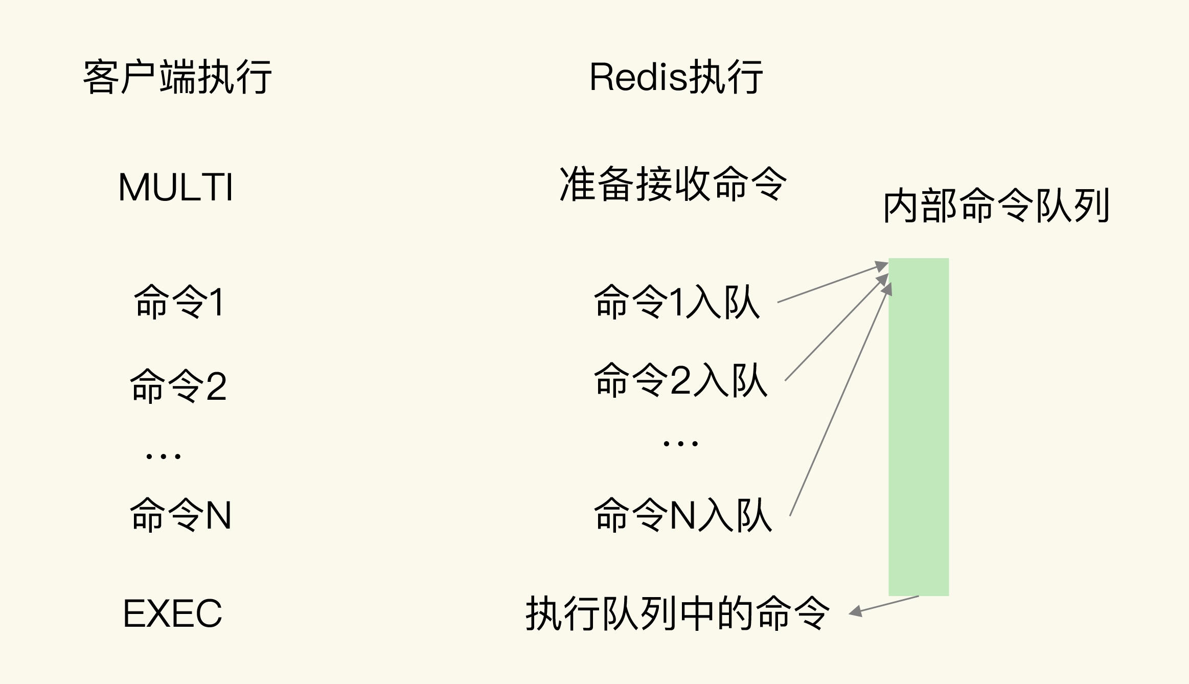 你可以看下下面这张示意图,命令 1 到命令 N 是在 MULTI 命令后、EXEC 命令前发送的,它们会被一起执行,保证原子性。