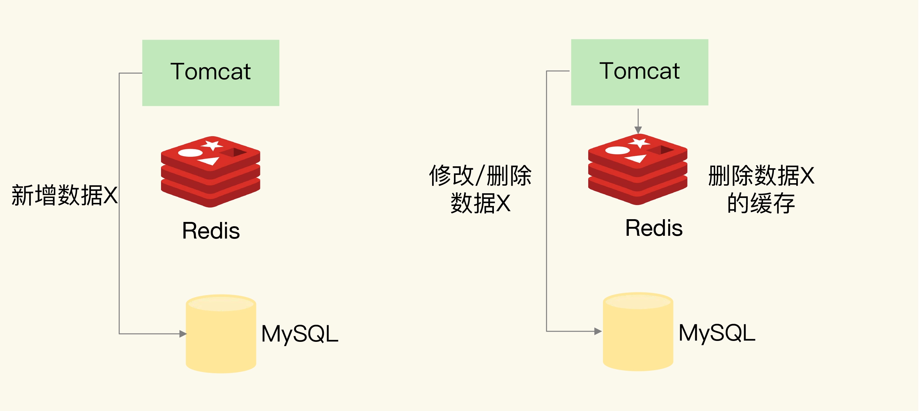 从图中可以看到,Tomcat 上运行的应用,无论是新增(Insert 操作)、修改(Update 操作)、还是删除(Delete 操作)数据 X,都会直接在数据库中增改删。当然,如果应用执行的是修改或删除操作,还会删除缓存的数据 X。