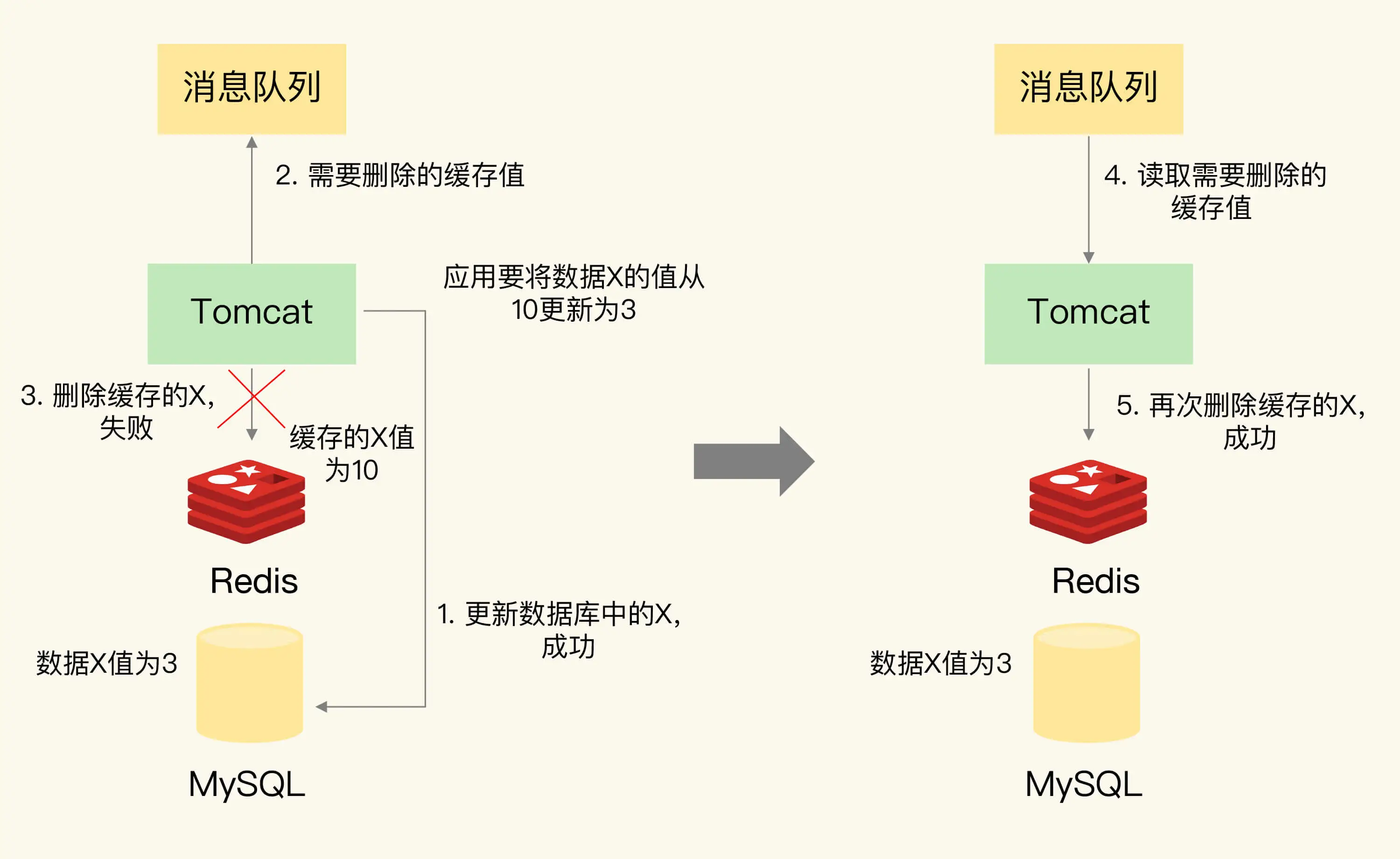 具体来说,可以把要删除的缓存值或者是要更新的数据库值暂存到消息队列中(例如使用 Kafka 消息队列)。当应用没有能够成功地删除缓存值或者是更新数据库值时,可以从消息队列中重新读取这些值,然后再次进行删除或更新。
