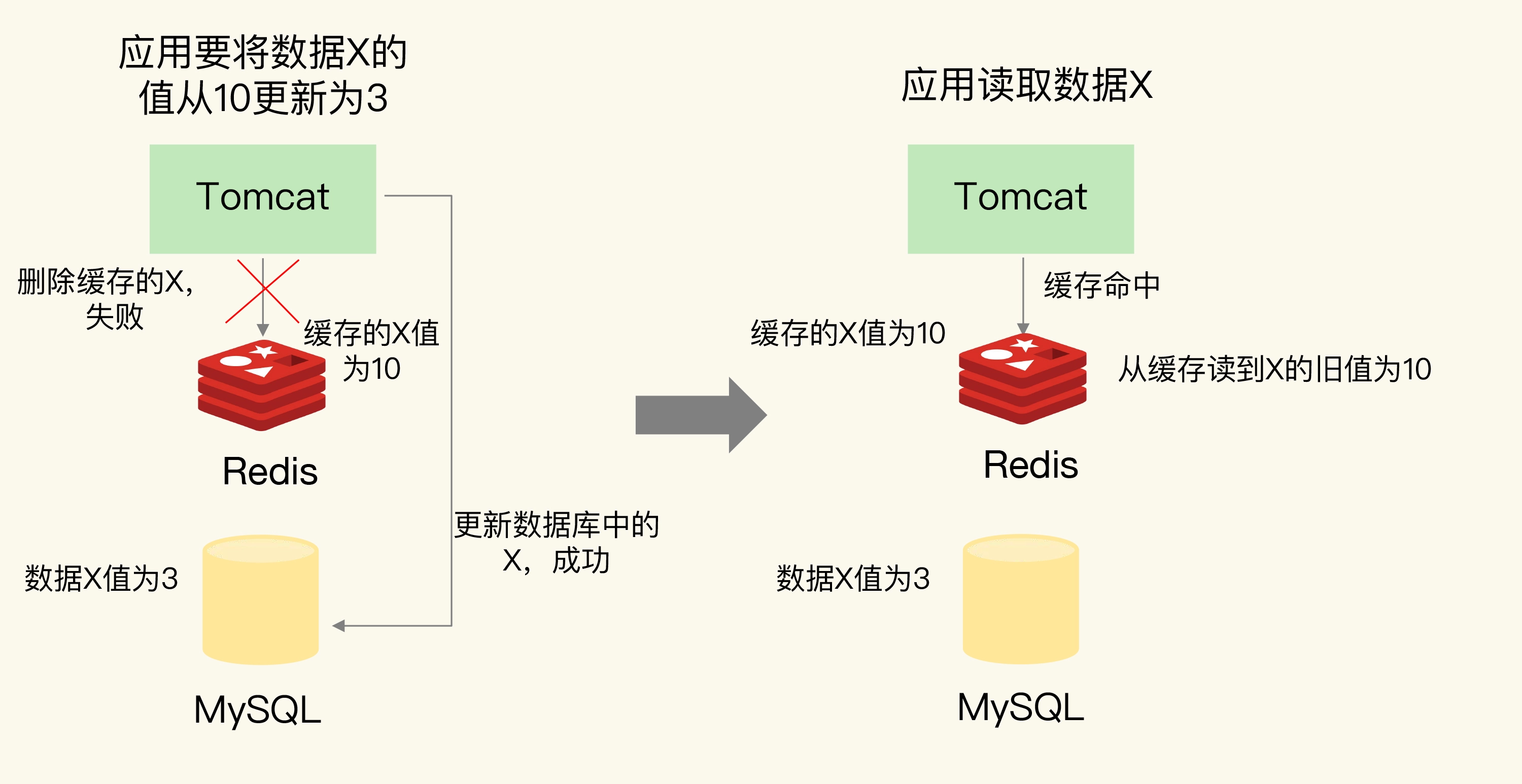 应用要把数据 X 的值从 10 更新为 3,先成功更新了数据库,然后在 Redis 缓存中删除 X 的缓存,但是这个操作却失败了,这个时候,数据库中 X 的新值为 3,Redis 中的 X 的缓存值为 10,这肯定是不一致的。如果刚好此时有其他客户端也发送请求访问 X,会先在 Redis 中查询,该客户端会发现缓存命中,但是读到的却是旧值 10。