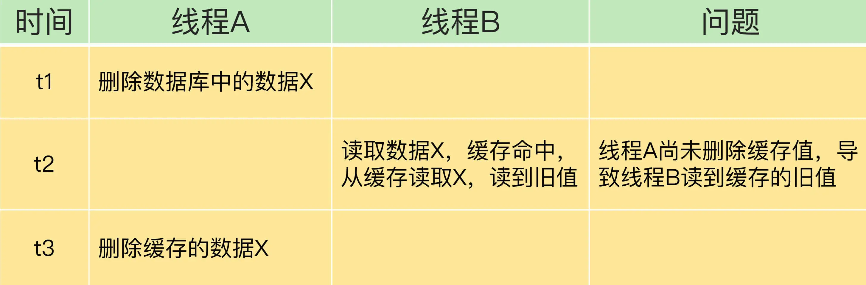 等到线程 B 从数据库读取完数据、更新了缓存后,线程 A 才开始更新数据库,此时,缓存中的数据是旧值,而数据库中的是最新值,两者就不一致了。