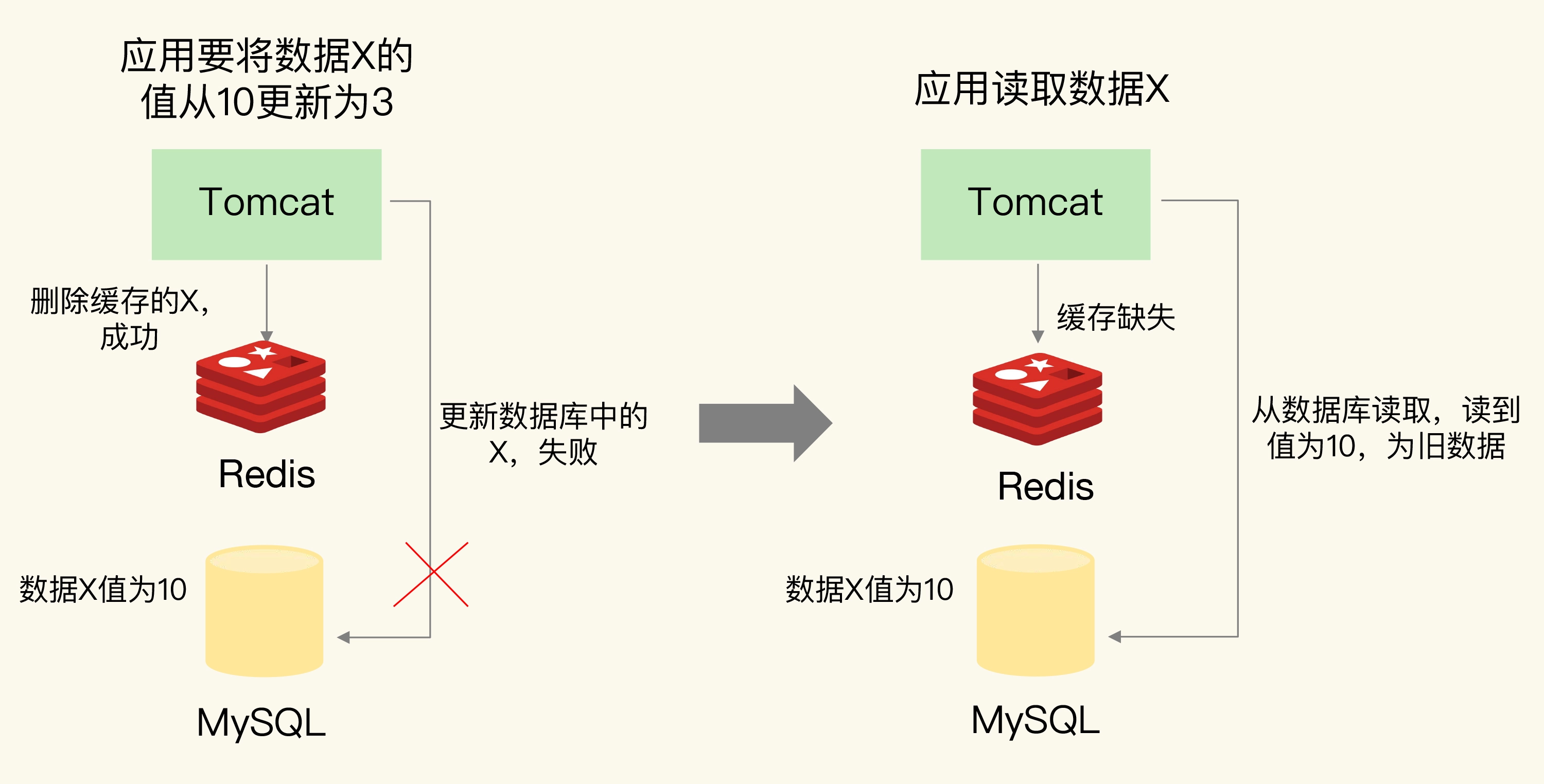 应用要把数据 X 的值从 10 更新为 3,先在 Redis 缓存中删除了 X 的缓存值,但是更新数据库却失败了。如果此时有其他并发的请求访问 X,会发现 Redis 中缓存缺失,紧接着,请求就会访问数据库,读到的却是旧值 10。