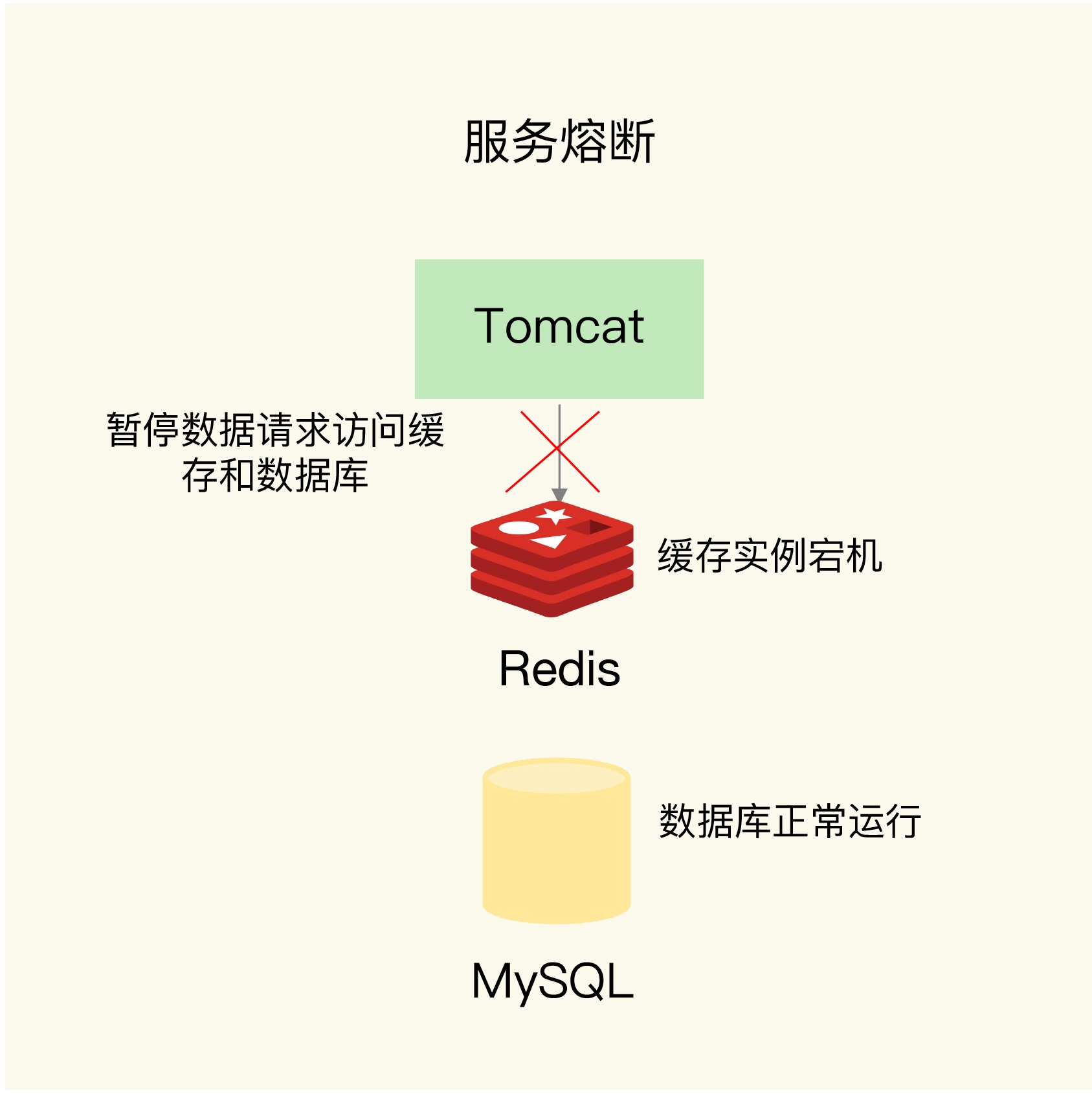 在业务系统运行时,我们可以监测 Redis 缓存所在机器和数据库所在机器的负载指标,例如每秒请求数、CPU 利用率、内存利用率等。如果我们发现 Redis 缓存实例宕机了,而数据库所在机器的负载压力突然增加(例如每秒请求数激增),此时,就发生缓存雪崩了。大量请求被发送到数据库进行处理。我们可以启动服务熔断机制,暂停业务应用对缓存服务的访问,从而降低对数据库的访问压力,如下图所示: