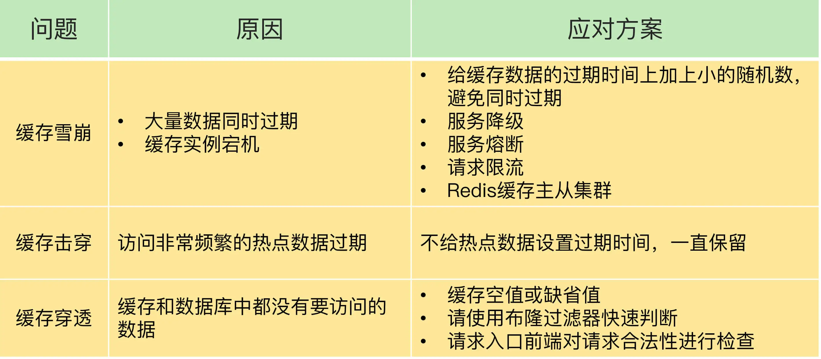 这节课,我们学习了缓存雪崩、击穿和穿透这三类异常问题。从问题成因来看,缓存雪崩和击穿主要是因为数据不在缓存中了,而缓存穿透则是因为数据既不在缓存中,也不在数据库中。所以,缓存雪崩或击穿时,一旦数据库中的数据被再次写入到缓存后,应用又可以在缓存中快速访问数据了,数据库的压力也会相应地降低下来,而缓存穿透发生时,Redis 缓存和数据库会同时持续承受请求压力。
