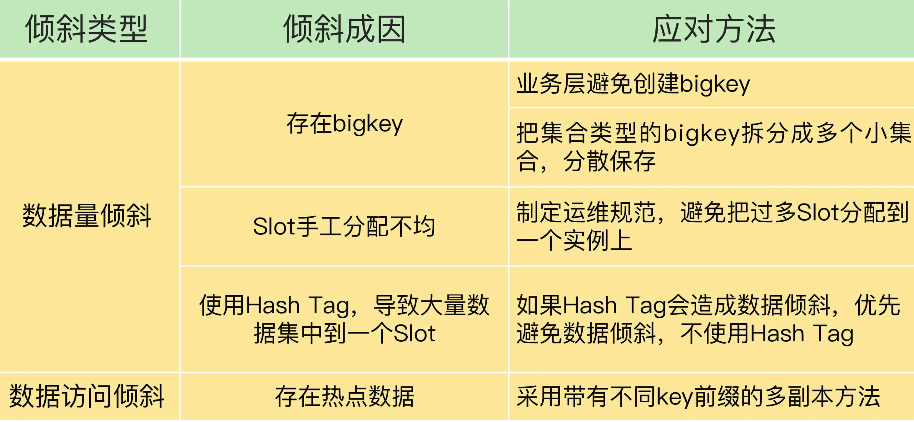 为了应对这个问题,我们可以通过运维规范,在分配之前,我们就要避免把过多的 Slot 分配到同一个实例。如果是已经分配好 Slot 的集群,我们可以先查看 Slot 和实例的具体分配关系,从而判断是否有过多的 Slot 集中到了同一个实例。如果有的话,就将部分 Slot 迁移到其它实例,从而避免数据倾斜。