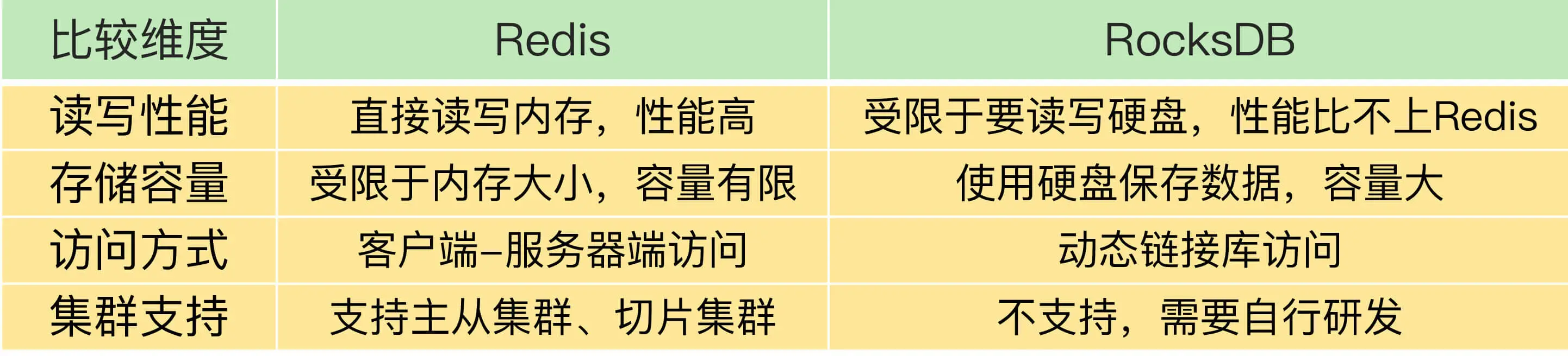 和 Redis 不同,RocksDB 可以把数据直接保存到硬盘上。这样一来,单个 RocksDB 可以保存的数据量要比 Redis 多很多,而且数据都能持久化保存下来。