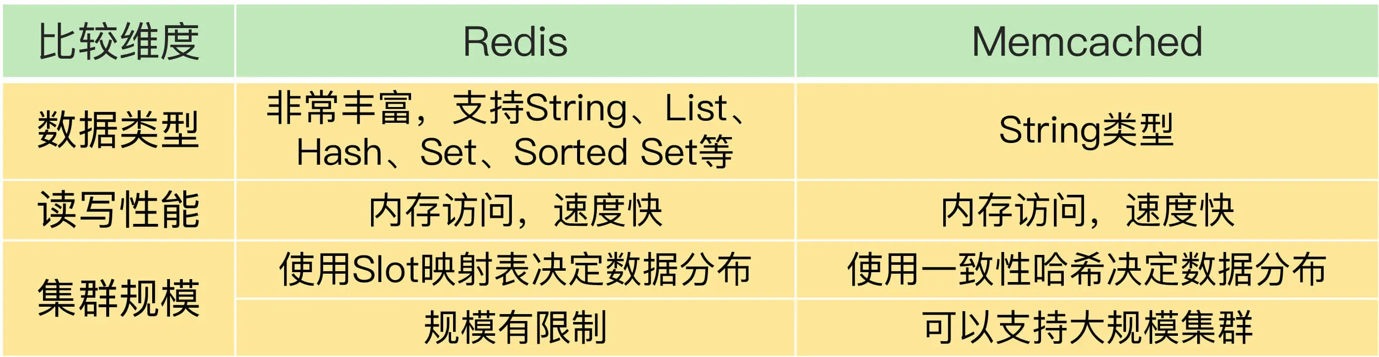 和 Redis 相似,Memcached 也经常被当做缓存来使用。不过,Memcached 有一个明显的优势,就是它的集群规模可以很大。Memcached 集群并不是像 Redis Cluster 或 Codis 那样,使用 Slot 映射来分配数据和实例的对应保存关系,而是使用一致性哈希算法把数据分散保存到多个实例上,而一致性哈希的优势就是可以支持大规模的集群。所以,如果我们需要部署大规模缓存集群,Memcached 会是一个不错的选择。