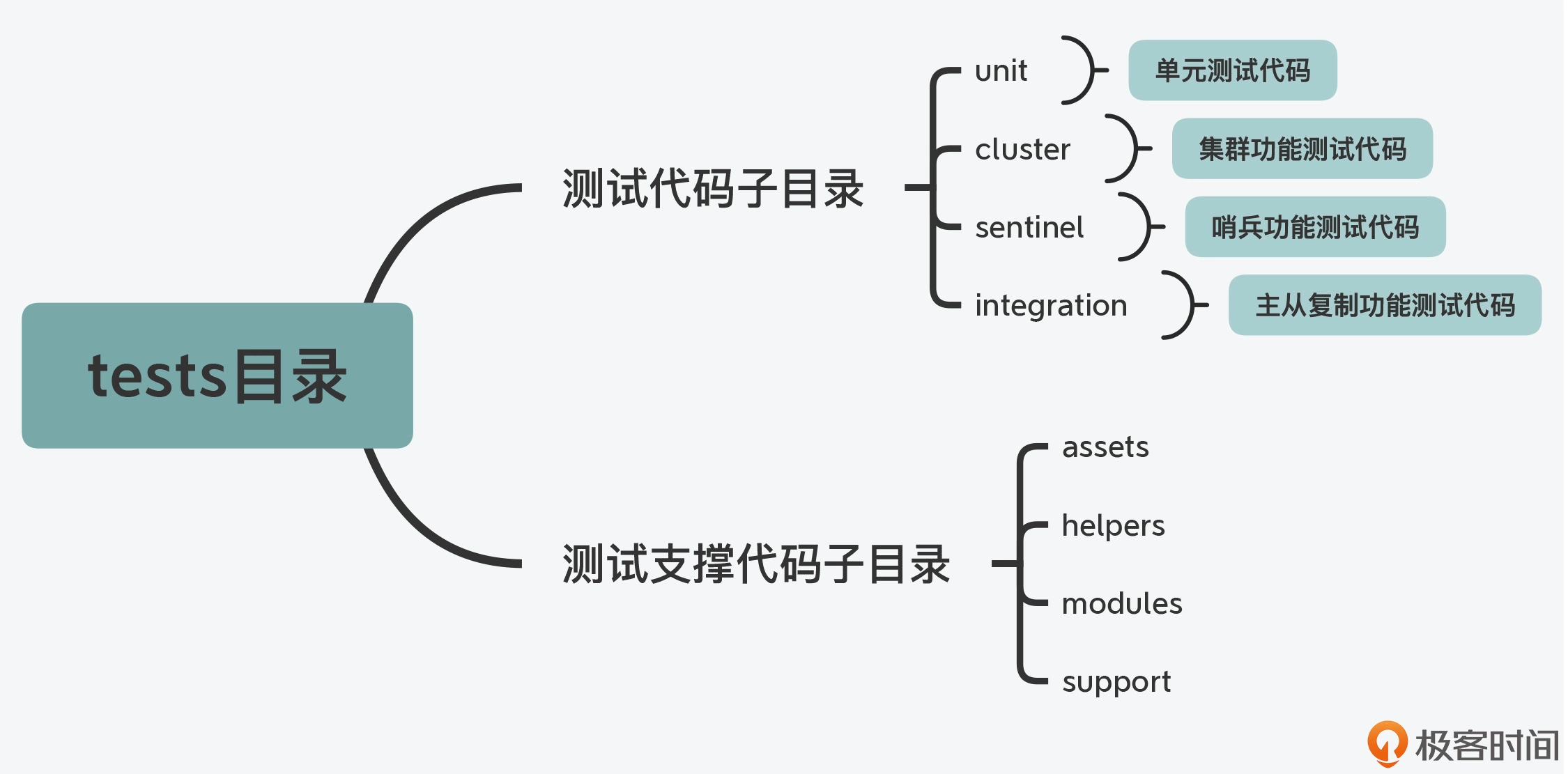 不过在 tests 目录中,除了有针对特定功能模块的测试代码外,还有一些代码是用来支撑测试功能的,这些代码在 assets、helpers、modules、support 四个目录中。这里我画了这张图,展示了 tests 目录下的代码结构和层次,你可以参考下。