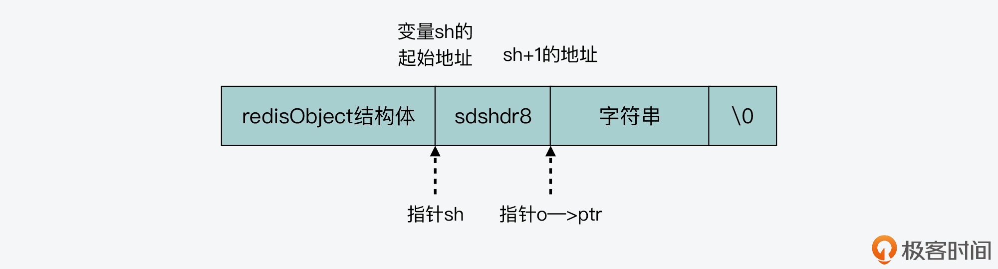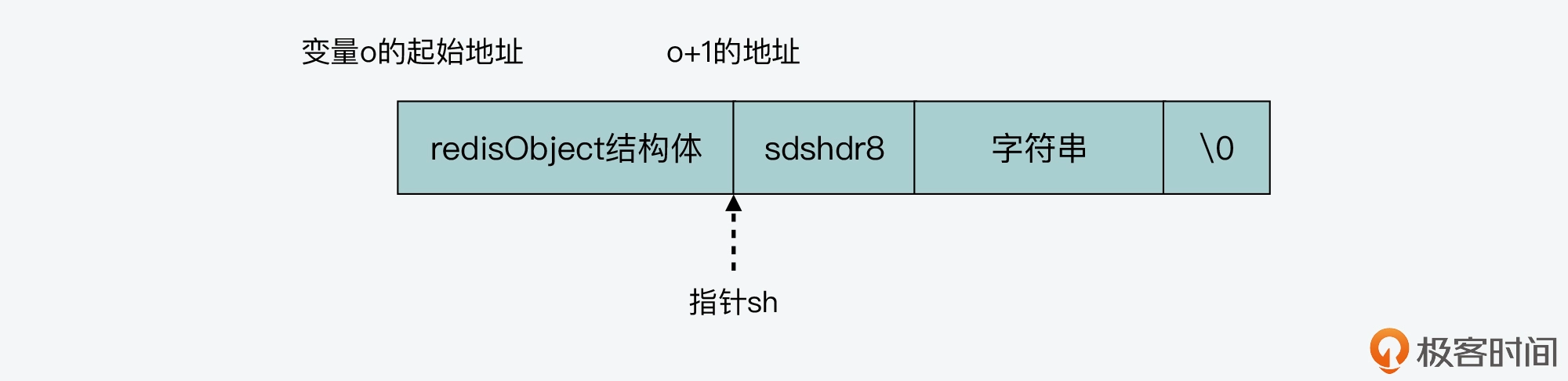 好,那么 createEmbeddedStringObject 函数在分配了内存空间之后,就会创建 SDS 结构的指针 sh,并把 sh 指向这块连续空间中 SDS 结构头所在的位置,下面的代码显示了这步操作。其中,o 是 redisObject 结构体的变量,o+1 表示将内存地址从变量 o 开始移动一段距离,而移动的距离等于 redisObject 这个结构体的大小。