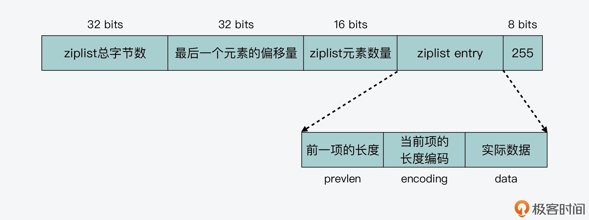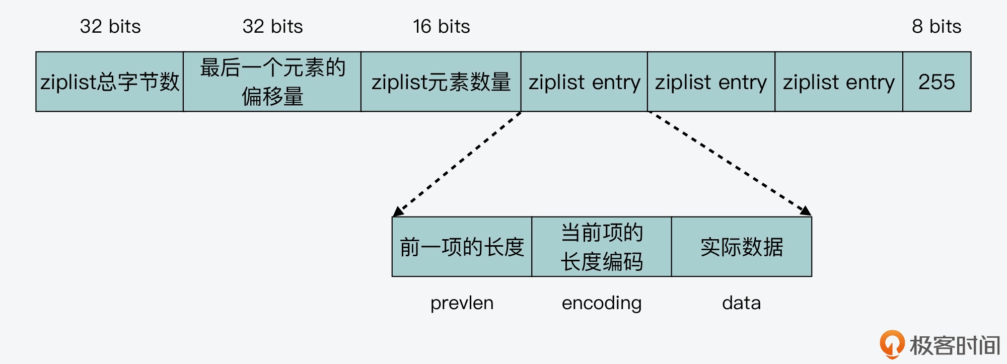 然后,当我们往 ziplist 中插入数据时,ziplist 就会根据数据是字符串还是整数,以及它们的大小进行不同的编码。这种根据数据大小进行相应编码的设计思想,正是 Redis 为了节省内存而采用的。