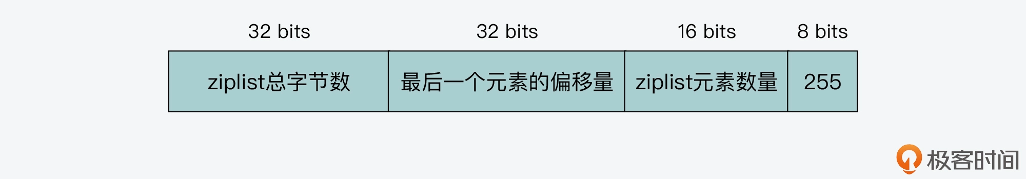 那么,在创建一个新的 ziplist 后,该列表的内存布局就如下图所示。注意,此时列表中还没有实际的数据。