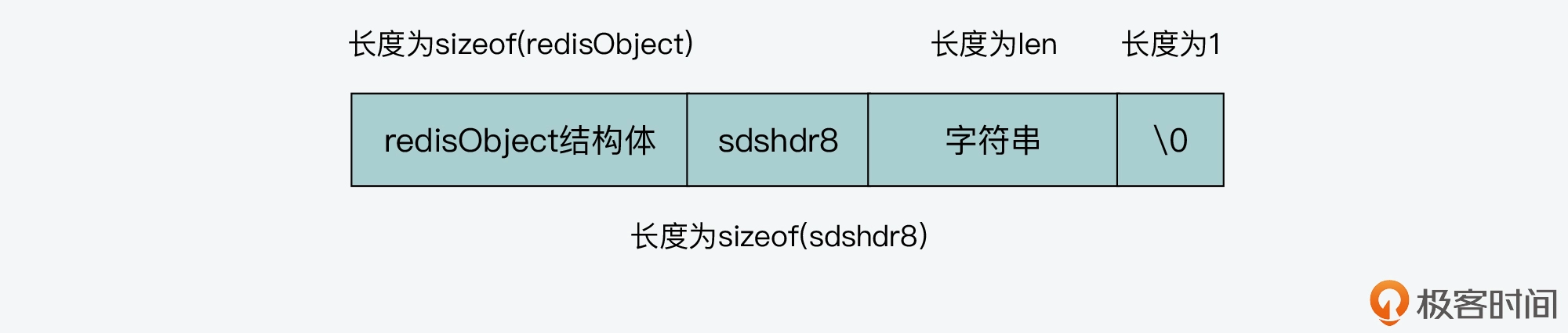 首先,createEmbeddedStringObject 函数会分配一块连续的内存空间,这块内存空间的大小等于 redisObject 结构体的大小、SDS 结构头 sdshdr8 的大小和字符串大小的总和,并且再加上 1 字节。注意,这里最后的 1 字节是 SDS 中加在字符串最后的结束字符“\0”。