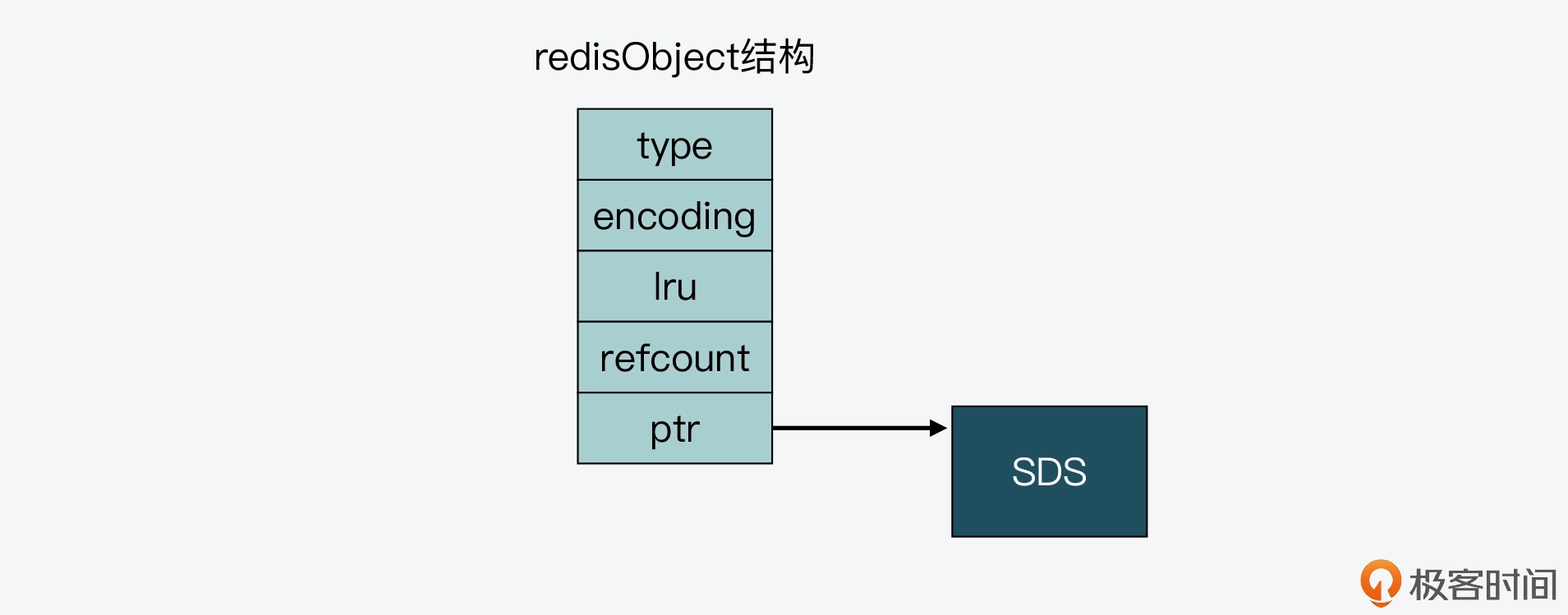 前面我说过,SDS 在保存比较小的字符串时,会使用嵌入式字符串的设计方法,将字符串直接保存在 redisObject 结构体中。然后在 redisObject 结构体中,存在一个指向值的指针 ptr,而一般来说,这个 ptr 指针会指向值的数据结构。