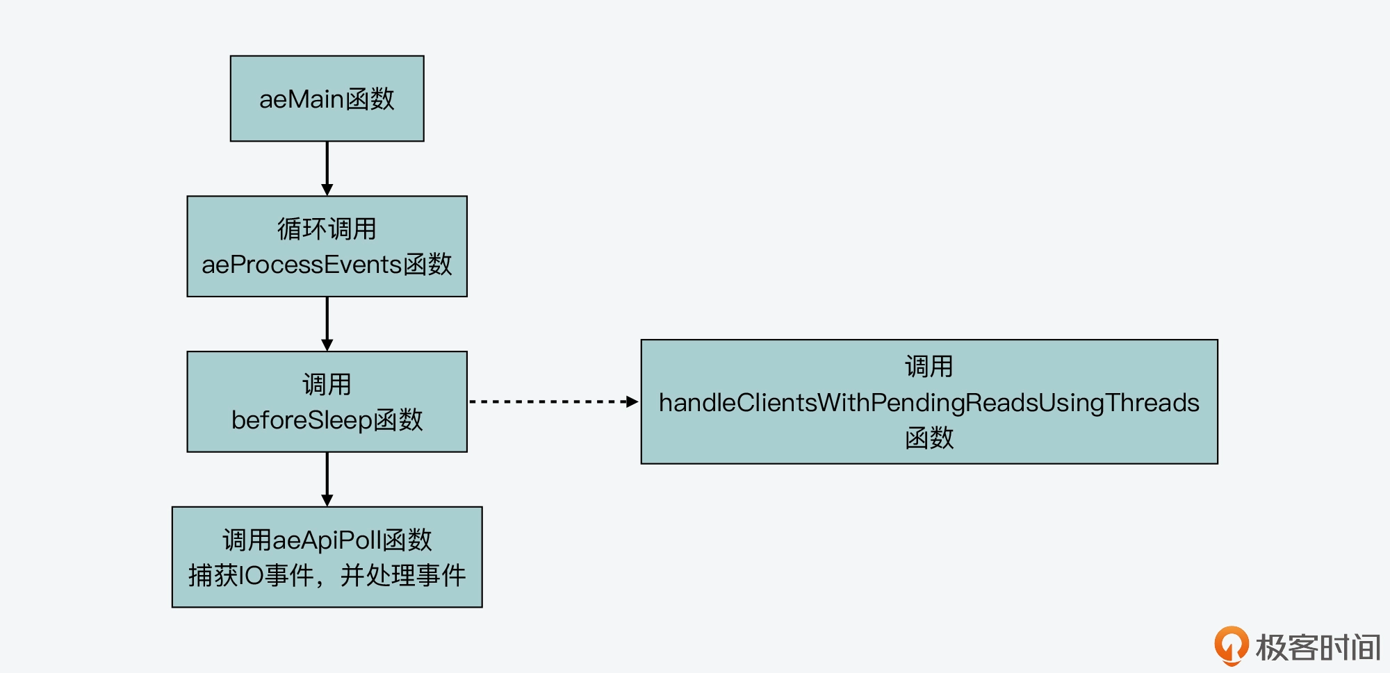 在 Redis 6.0 版本的代码中,事件驱动框架同样是调用 aeMain 函数来执行事件循环流程,该循环流程会调用 aeProcessEvents 函数处理各种事件。而在 aeProcessEvents 函数实际调用 aeApiPoll 函数捕获 IO 事件之前,beforeSleep 函数会被调用。