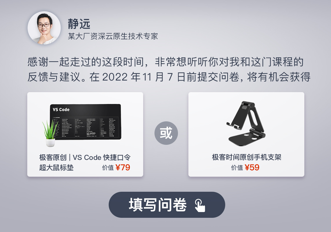 最后,我准备了一份毕业问卷,希望你可以花两分钟的时间填写一下。我会认真倾听你对这个专栏的意见或建议,期待你的反馈。我也会同时保持课程的最新技术更新,再次感谢你选择了我,我们江湖再见。