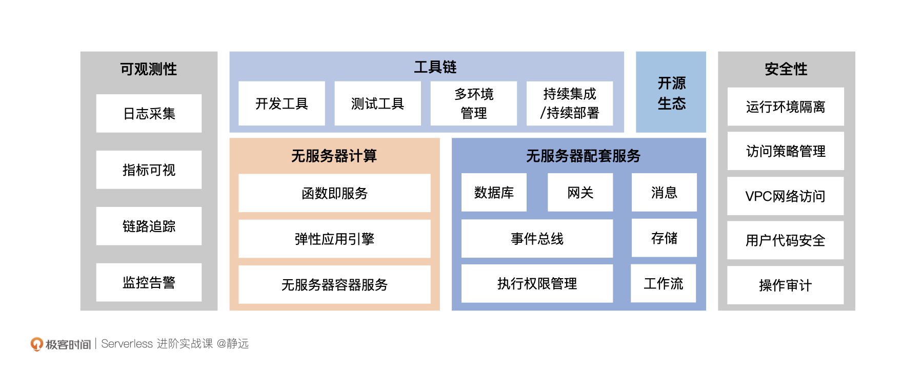 我再附上一张信通院标准书中的Serverless解决方案图,帮助你更好地梳理Serverless的知识要点,在课程的开始,构建起Serverless的模型和思维。