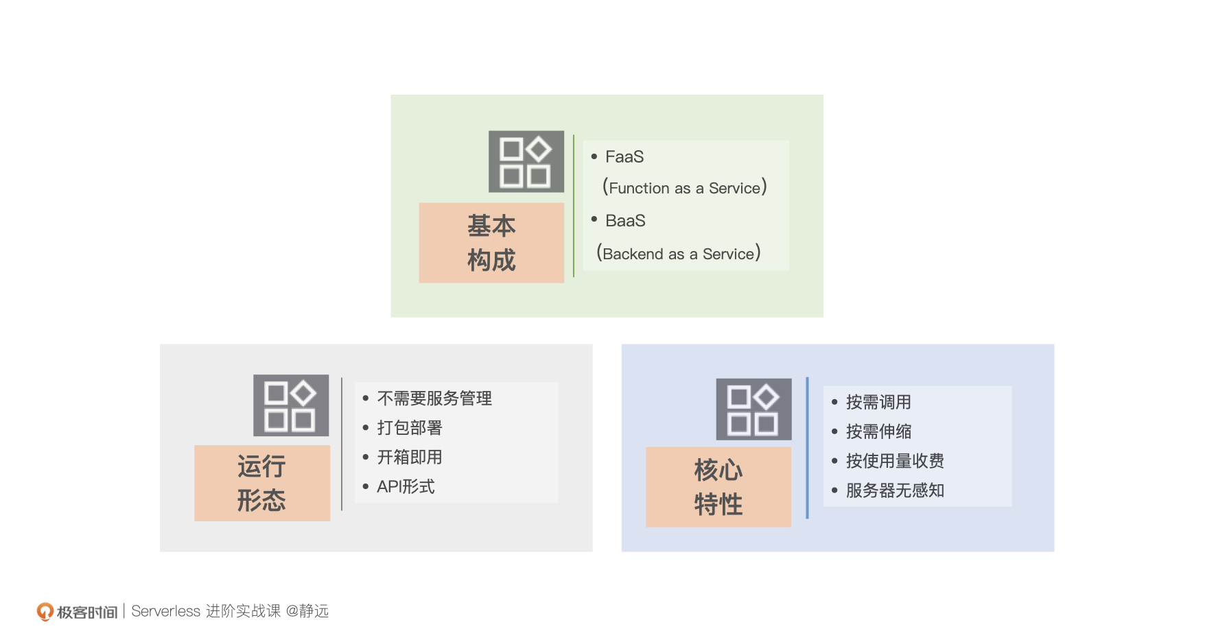 Serverless是能够实现业务和基础设施分离,提升用户业务创新能力的理念我给你整理了一个图,突出几个核心特征组成了它的形式:
