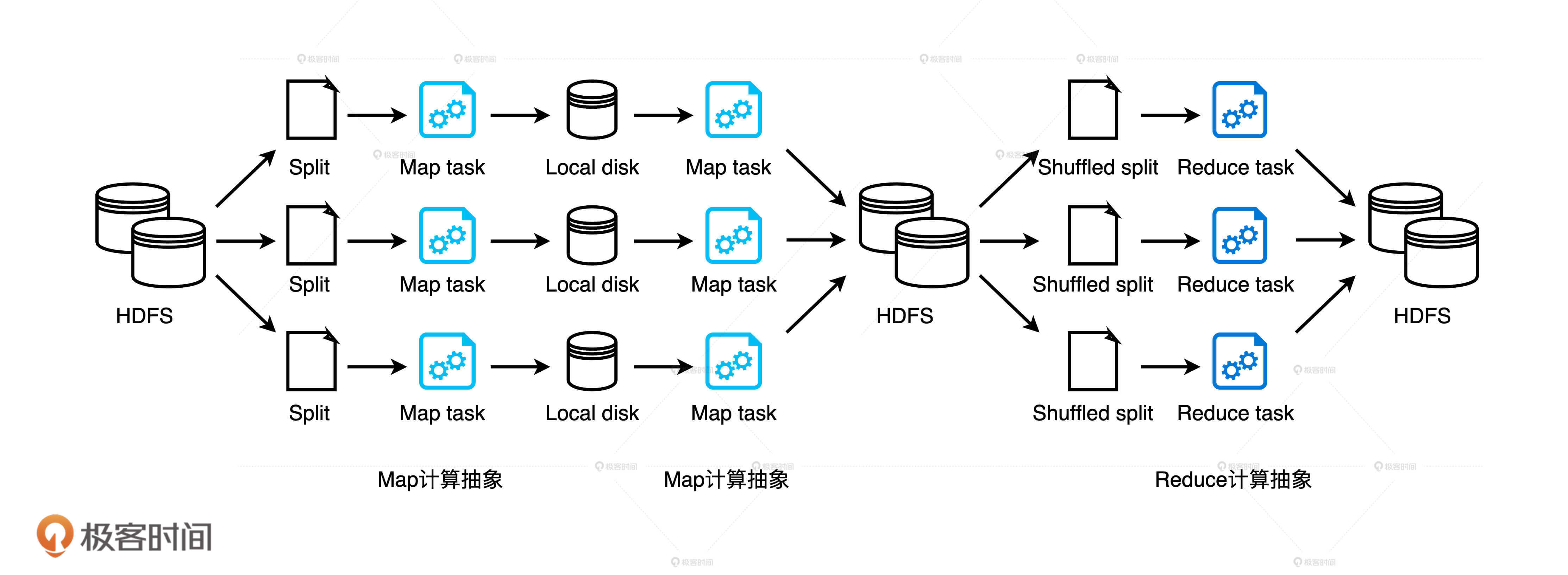 你可能会问:“费了半天劲,把DAG变成Stages有啥用呢?”还真有用!内存计算的第二层含义,就隐匿于从DAG划分出的一个又一个Stages之中。不过,要弄清楚Stage内的流水线式计算模式,我们还是得从Hadoop MapReduce的计算模型说起。